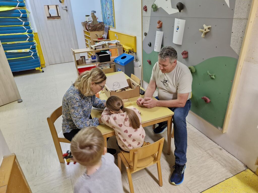 In tako je prišel težko pričakovani četrtek. Ni vsak dan, da stari starši preživijo skupaj z vnuki dan v vrtcu in tokrat je šlo čisto zares. Da so stvari res tekle tako kot je potrebno, smo pripravili potreben material za izdelavo punčk, lesenih vozil, družabnih iger: blago, sukanec, polnilo, lesene kolute, plutovinaste zamaške, osi za lesena kolesa, orodje…