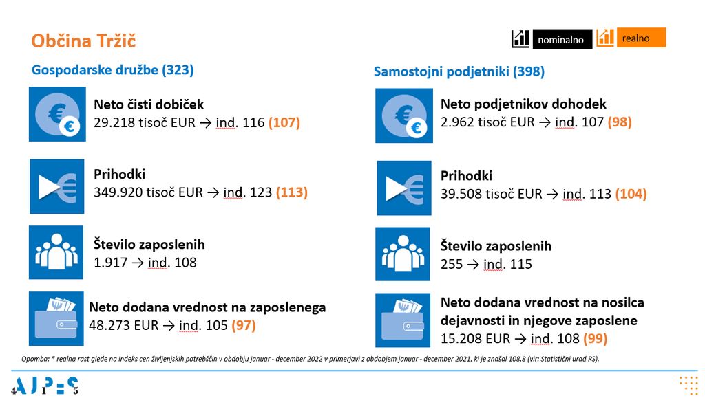 Več podatkov o poslovanju poslovnih subjektov v letu 2022 v občinah gorenjske regije si lahko preberete v Informaciji o poslovanju gospodarskih družb, samostojnih podjetnikov in zadrug v gorenjski regiji v letu 2022.