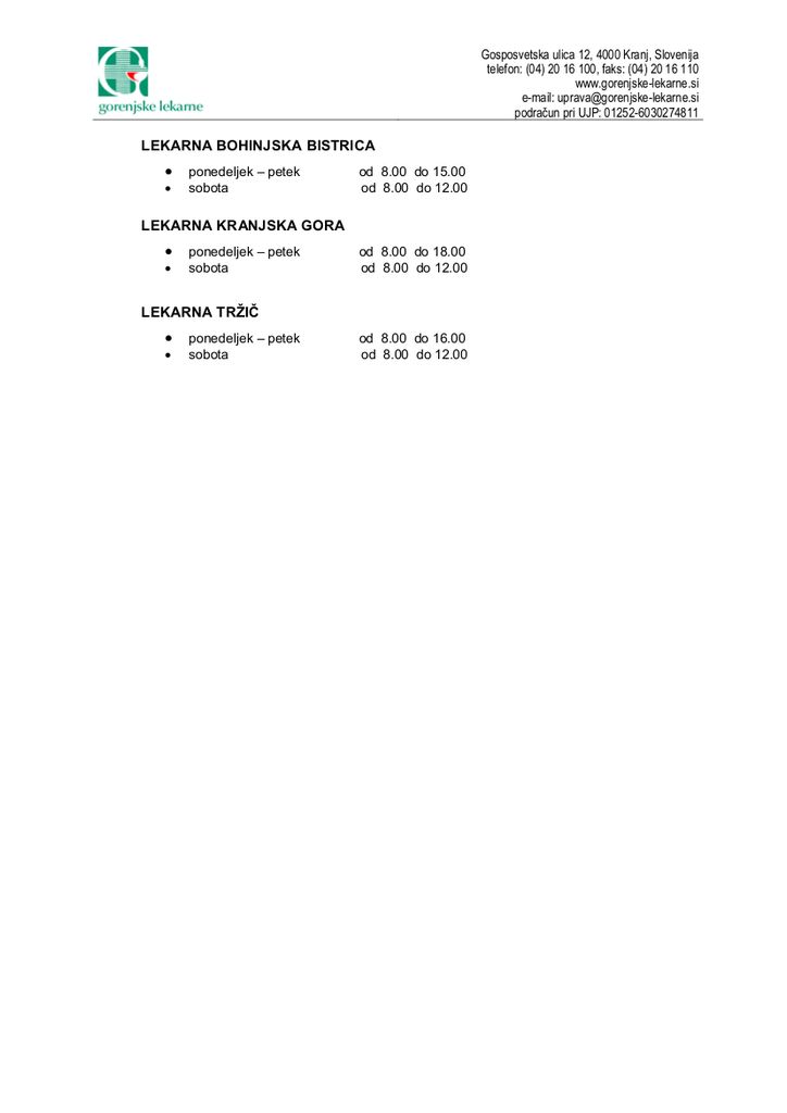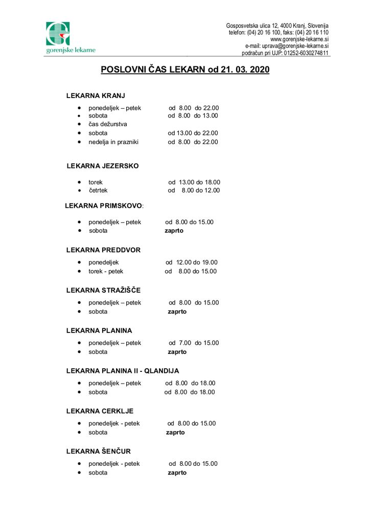 Občine ustanoviteljice, Lekarniška zbornica Slovenije, Zavod za zdravstveno zavarovanje Slovenije OE Kranj obveščajo, da so v skladu s priporočilom Ministrstva za zdravje glede možnih sprememb v organiziranosti dela v lekarnah ter lekarniške dejavnosti v povezavi z izvajanjem zaščitnega ukrepa za namen preprečevanja širjenja okužb s korona virusom, spremenili odpiralne čase lekarn. Od 21. marca 2020 bo Lekarna Tržič odprta od ponedeljka do petka od 8. do 16. ure, ob sobotah pa od 8. do 12. ure.