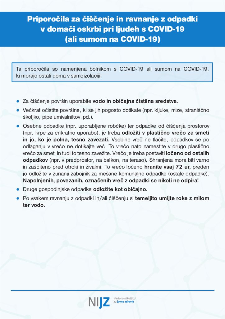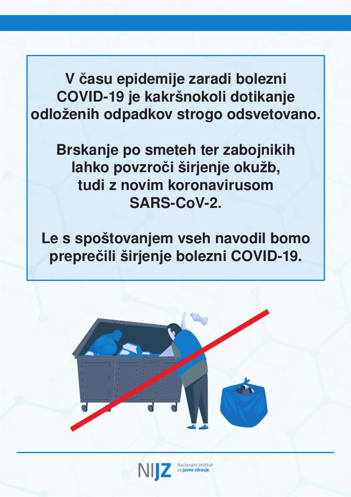 - V času epidemije zaradi bolezni COVID-19 je kakršnokoli dotikanje odloženih odpadkov strogo odsvetovano. Brskanje po smeteh ter zabojnikih lahko povzroči širjenje okužb, tudi z novim koronavirusom SARS-CoV-2. Le s spoštovanjem vseh navodil bomo preprečili širjenje bolezni COVID-19. Priporočila za čiščenje in ravnanje z odpadki v domači oskrbi pri ljudeh s COVID-19 (ali sumom na COVID-19) si preberite na (https://www.nijz.si/sl/priporocila-za-ciscenje-in-ravnanje-z-odpadki-v-domaci-oskrbi-pri-ljudeh-s-covid-19-ali-sumom-na