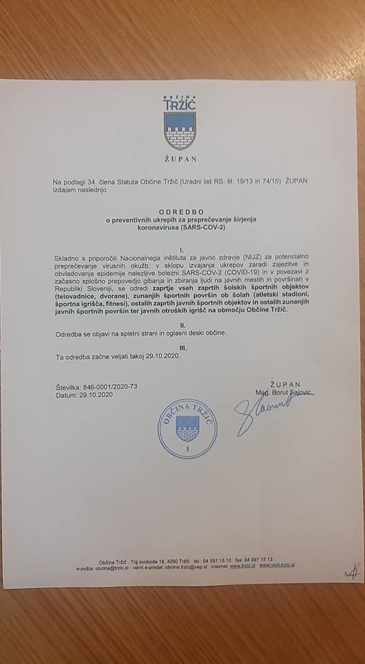 Skladno s priporočili epidemiološke stroke ter ob prošnjah in apelih zdravstvenega osebja, zapiramo vse športne objekte v občini Tržič.