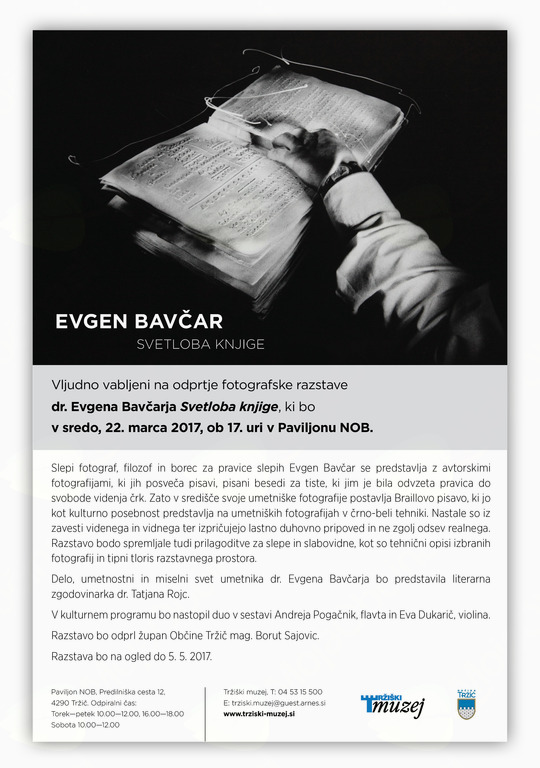 Svetloba knjige je naslov fotografske razstave dr. Evgena Bavčarja, slepega fotografa, filozofa in borca za pravice slepih, ki se v tržiški galeriji predstavlja z avtorskimi fotografijami, ki jih posveča pisavi, pisani besedi za tiste, ki jim je bila odvzeta pravica do svobode videnja črk.