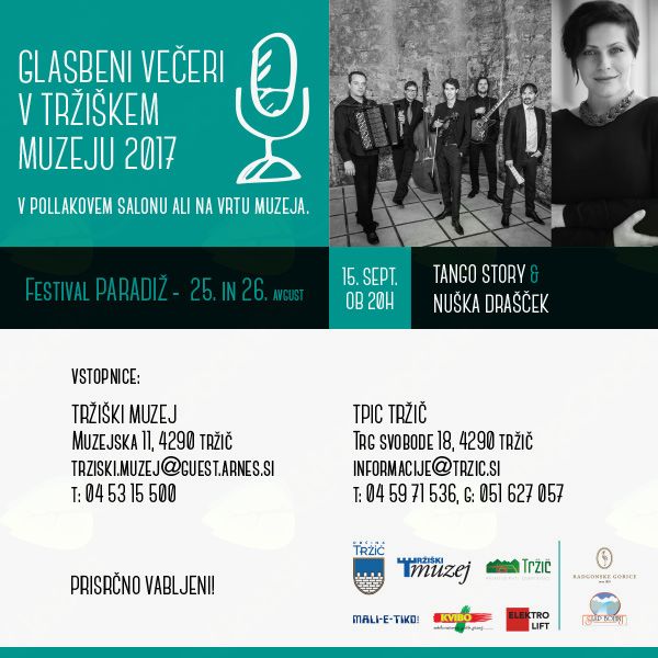 Glasbeni večeri v Tržiškem muzeju se v tretji sezoni zaključujejo v petek, 15. septembra 2017, ob 20. uri s koncertom Tango story & Nuške Drašček. Koncert bo na vrtu muzeja, v primeru slabega vremena pa v Germovki.TANGO STORY je projekt Evropske prestolnice kulture Maribor 2012 – Ptuj. Skupaj z svetovno znanim violinistom Stefanom Milenkovičem, je nastopil na največjih odrih v Sloveniji, Hrvaški in Bosni in Hercegovini, ter imel zelo uspešno turnejo v ZDA. Tokrat se vrača v prenovljeni zasedbi z enim najpomembnejših virtuozov današnje generacije na harmoniki Borutom Zagoranskim.Tango Story so:
