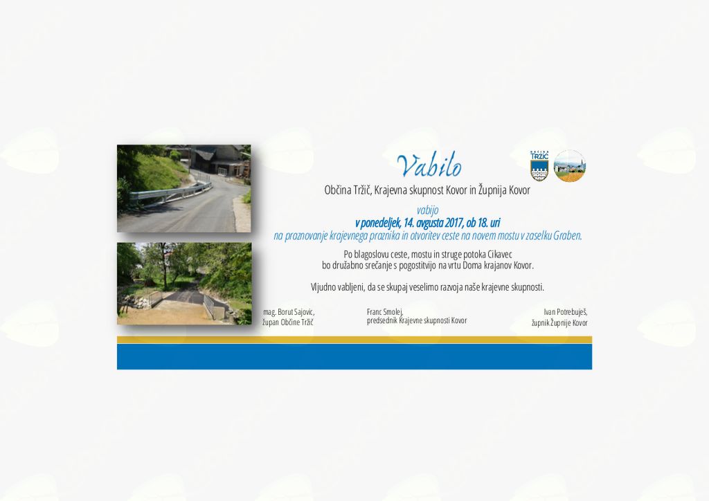 Krajevna skupnost Kovor v okviru praznovanje krajevnega praznika Velikega Šmarna vabi krajane v ponedeljek 14. avgusta na otvoritev nove ceste. Otvoritev bo ob 18. uri na novem mostu v Grabnu. Krajane bosta pozdravila predsednik Krajevne skupnosti Kovor in župan Občine Tržič, mag. Borut Sajovic.