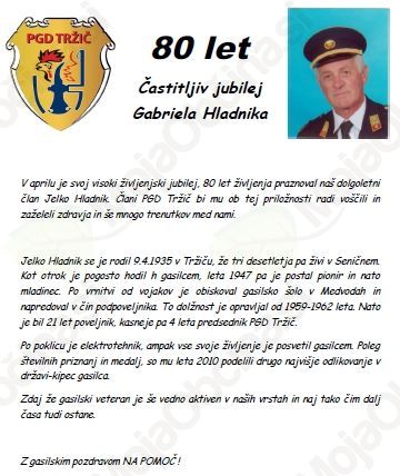 Veteran PGD Tržič Gabriel Hladnik je v mesecu aprilu praznoval visok jubilej, 80 let. Izhaja iz tržiške gasilske družine. Oče Franc in brata Leon in Niko so bili zvesti pripadniki gasilski humani dejavnosti v Tržiču.