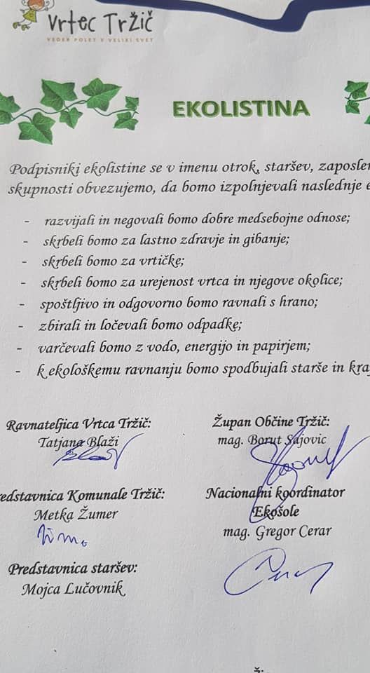 Tudi Vrtec Tržič stopa na pot skoraj sedemstotih EKO šol, vrtcev in podobnih ustanov. V sredo, 22. januarja, smo podpisali t. i. EKOLISTINO, ki nas zavezuje, da bomo ravnali okolju prijazno. To pomeni, da skrbimo za dobre odnose, zdravje in gibanje, da skrbimo za okolico, vrtičke in javne površine, tudi za urejenost vrtca in njegove okolice. Potem pa so tu še dodane vrednosti, in sicer spoštljivo in odgovorno ravnanje s hrano, skrb za odpadke na vseh področjih ter varčevanje na področju vode, energije in papirja. Nenazadnje pa tudi, da na področju transporta ravnamo ekološko.