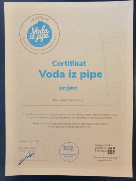 V petek, 19. aprila je Komunala Tržič d.o.o. na Zbornici komunalnega gospodarstva v Ljubljani prejela certifikat Voda iz pipe, ki ga je prejelo prvih 30 organizacij, po večini komunalna podjetja. Obenem so podpisali zavezo certifikata Voda iz pipe. To pomeni, da bodo v svojih poslovnih prostorih in na dogodkih, ki jih bodo organizirali, ponujali izključno vodo iz pipe in ne predpakirane vode. K pitju vode iz pipe bodo spodbujali svoje zaposlene, partnerje in podizvajalce. Prakso pitja vode iz pipe v podjetju izvajajo že dobro desetletje. Zaposlene in ostale deležnike bodo tudi v prihodnje ozaveščali, da imamo v Sloveniji zdravo in kakovostno pitno vodo, ki je bolj zdrava in okolju veliko prijaznejša kot predpakirana voda.