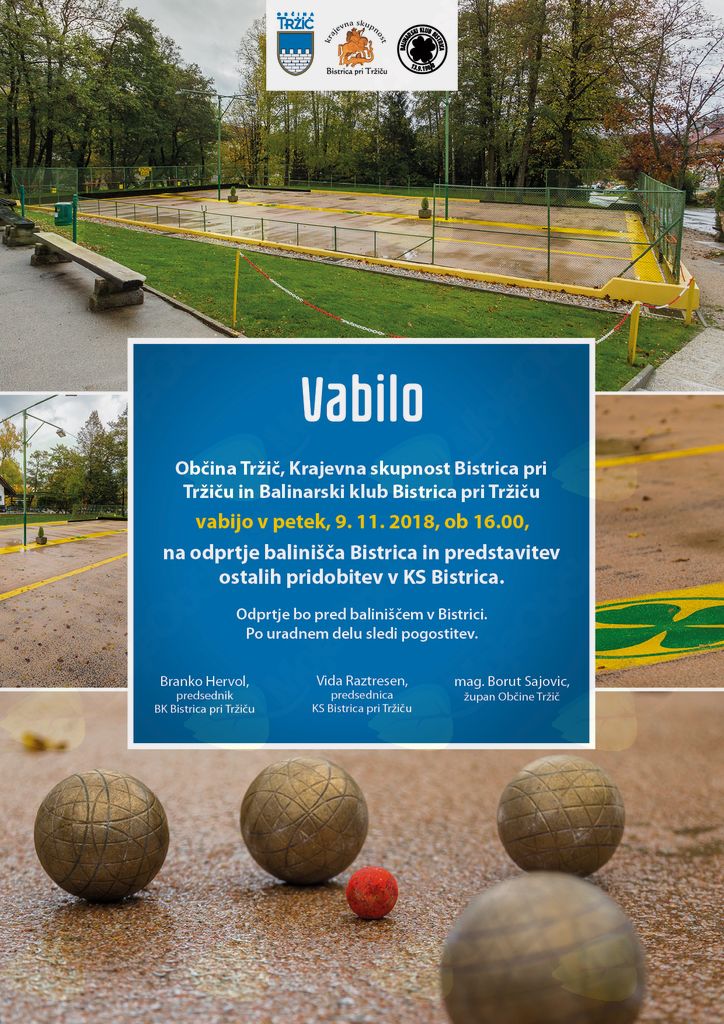 Občina Tržič, Krajevna skupnost Bistrica pri Tržiču in Balinarski klub Bistrica pri Tržiču vabijo v petek, 9. novembra 2018, ob 16. uri na odprtje balinišča Bistrica in predstavitev ostalih pridobitev v KS Bistrica.