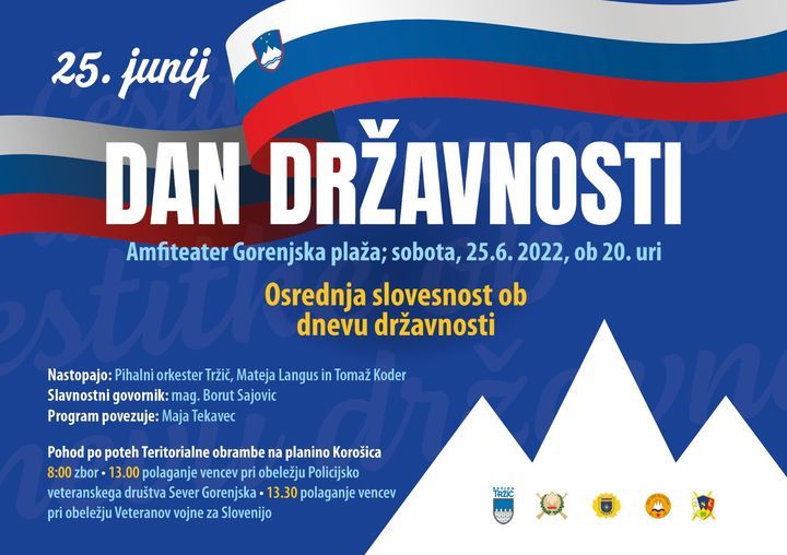 Občina Tržič vas vabi na osrednjo svečanost ob dnevu državnosti, ki bo v soboto, 25. junija 2022, ob 20. uri v amfiteatru Gorenjska plaža.