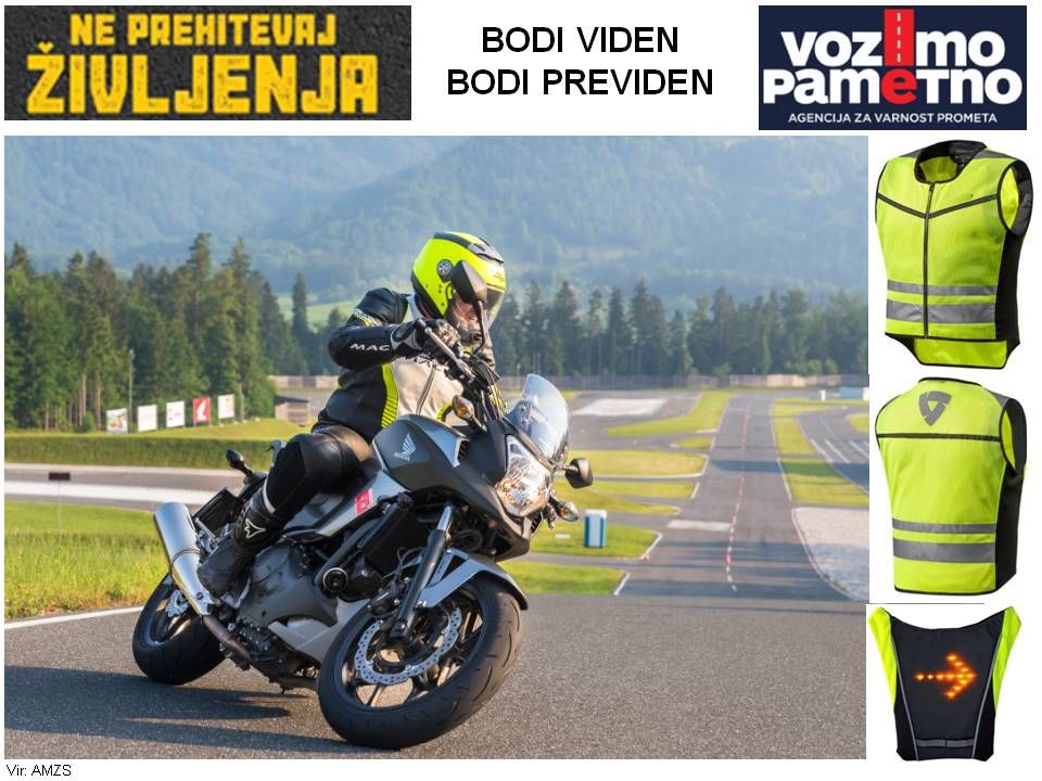 - vedno vozite s prižganimi lučmi ter si nadenite odsevni telovnik, da boste bolje vidni in prej opazni, saj je vidnost ključni element varnosti v prometu;