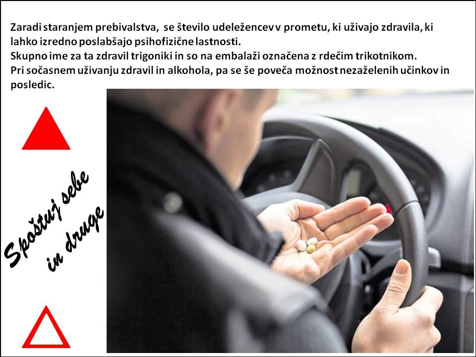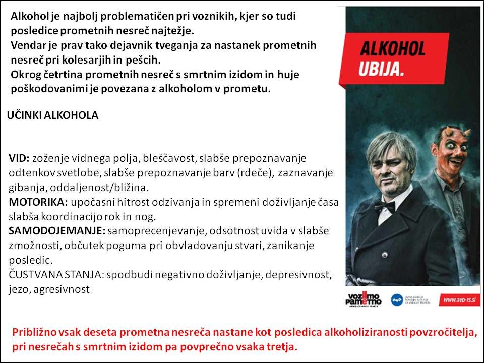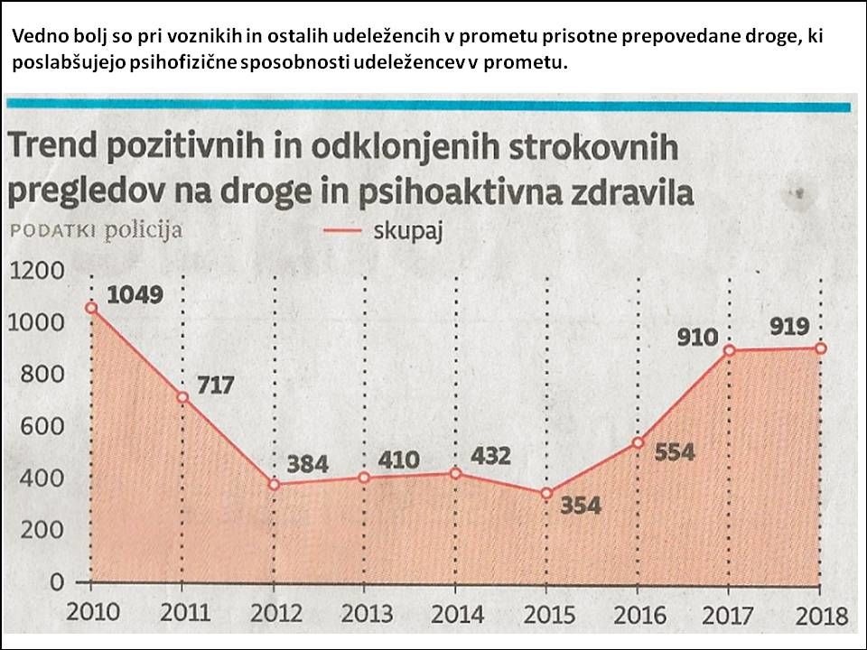 Alkohol je na slovenskih cestah žal prisoten pri vsaki tretji prometni nesreči s smrtnim izidom, čeprav se vlaga veliko naporov, da bi alkohol "odšel" z naših cest. Vse opaznejša pa je tudi uporaba drog in drugih psiho-aktivnih snovi, kot so razna zdravila. Še usodneje je, če se uživanju zdravil in/ali drog pridruži še alkohol. Učinki kombinacij so nepredvidljivi, v vsakem primeru pa se še bistveno poslabšajo psihofizične sposobnosti uživalcev, udeležencev v prometu.