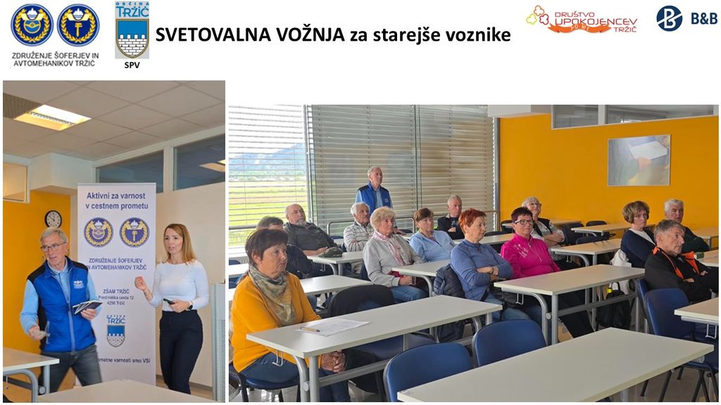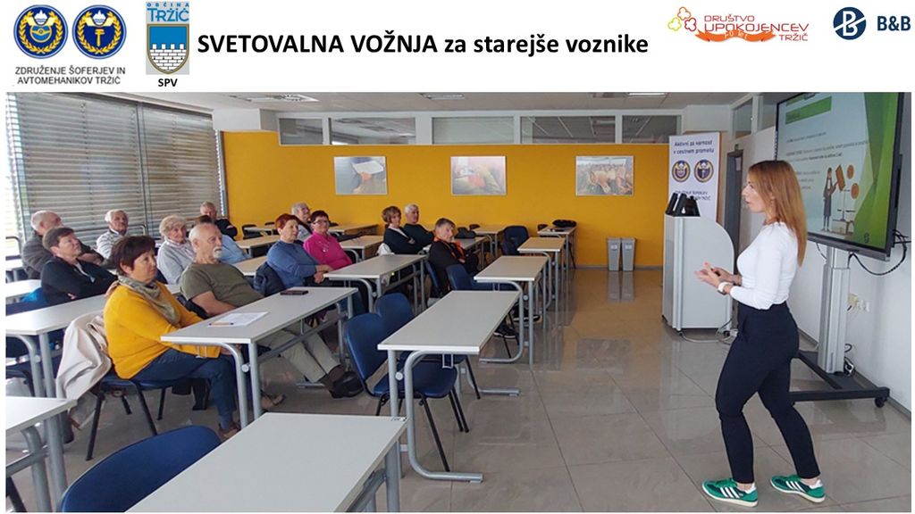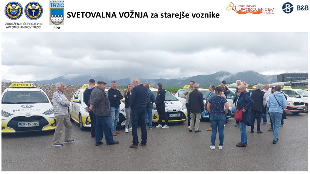 Dogodka, ki je bil sestavljen iz dveh vsebinskih sklopov, se je udeležilo 16 starejših voznikov. V prvem sklopu namenjenemu celotni skupini, smo se udeleženci v predavalnici IC B&B, seznanili s pomembnejšimi in novimi vsebinami s področja cestno prometnih predpisov. V drugem sklopu, pa smo individualno z vozili Šole vožnje B&B, opravili vožnje po izpitnih trasah v Kranju in njegovi okolici. Izvedbo obeh sklopov dogodka je v celoti zagotovil strokovni kader Šole vožnje B&B.