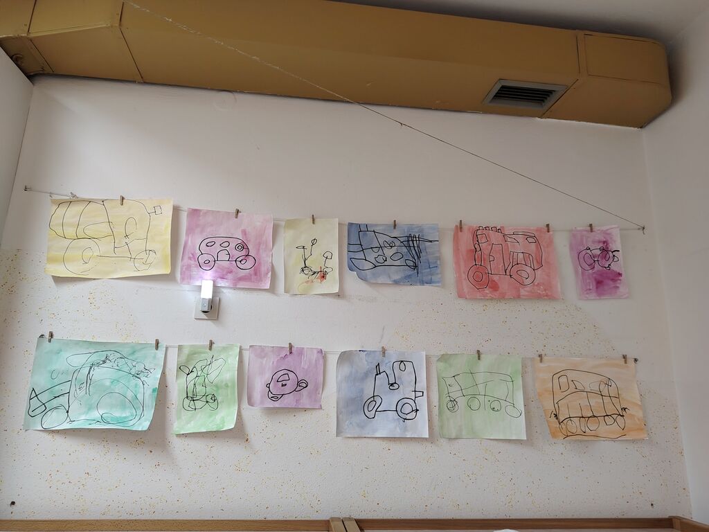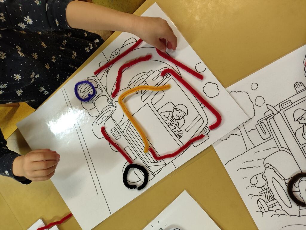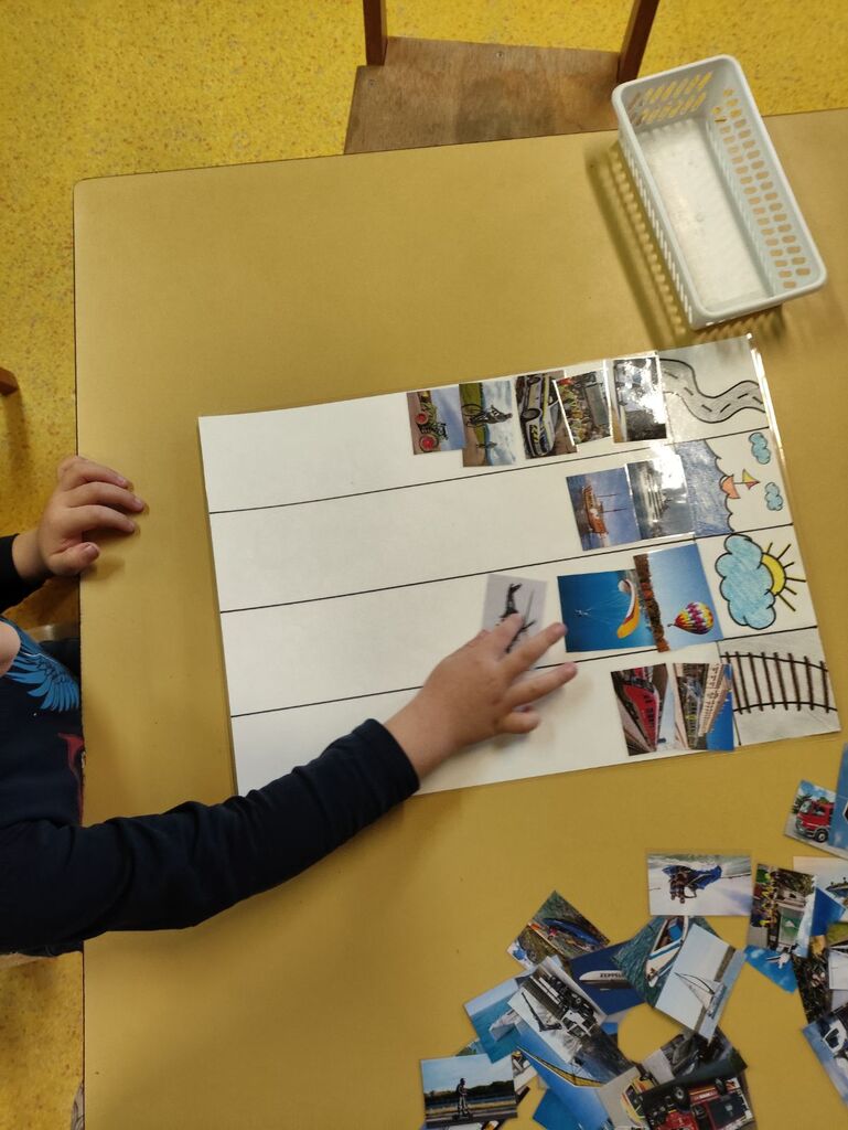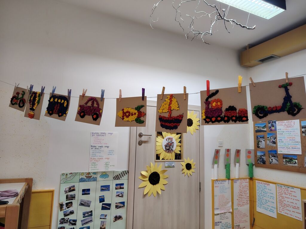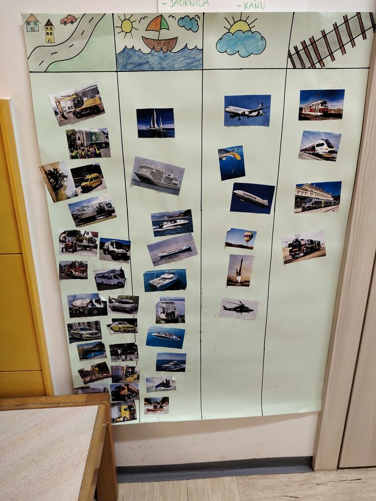 Vsak otrok je tudi poljubno narisal svoje prevozno sredstvo in ga pobarval. Risbice smo obesili v garderobo in po naši igralnici. Otrokom sva izdelali didaktično igro o vozilih: »KJE SE VOZIJO VOZILA?« Po cesti, po tirnicah, po vodi, po zraku. Otroci so igro imeli na razpolago ves čas v kotičku in so po njej posegali samostojno.