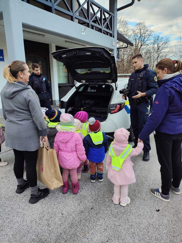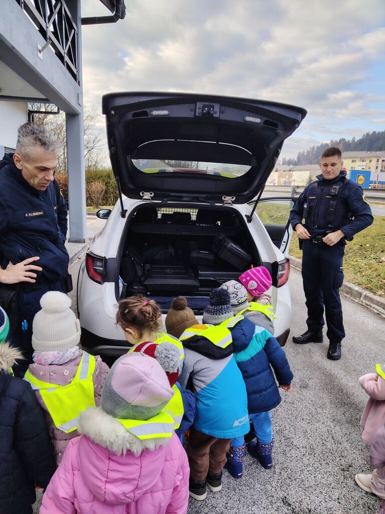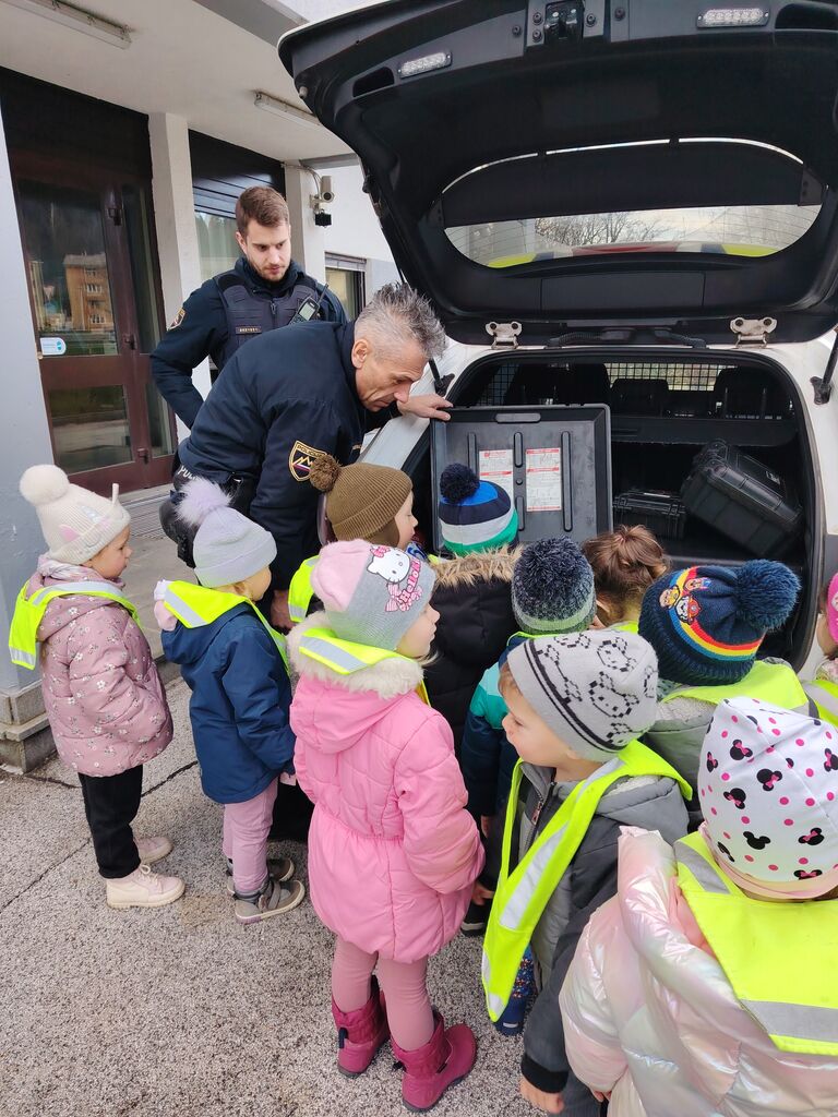 Obiskali smo Policijsko postajo Tržič, kjer nas je prijazno sprejel gospod policist Andraž. S svojim sodelavcem nam je razkazal policijsko vozilo in policijski kombi (marico), mi pa smo se lahko usedli za volan, trobili, prižigali lučke in sireno. Navdušenje otrok je bilo neizmerno in neprecenljivo. Predstavila sta nam svoj poklic, policijsko opremo in pripomočke, ki jih uporabljata pri vsakodnevnih nalogah: palico, merilec hitrosti, sprej za označevanje, solzivec, kolo za merjenje, lisice, voki-toki, pištolo, zaščitni jopič, kamero, neprebojni jopič, čeladi (navadno in neprebojno) ... večino pripomočkov so otroci z velikim zanimanjem lahko preizkusili, pomerili njihova zaščitna oblačila in čeladi.