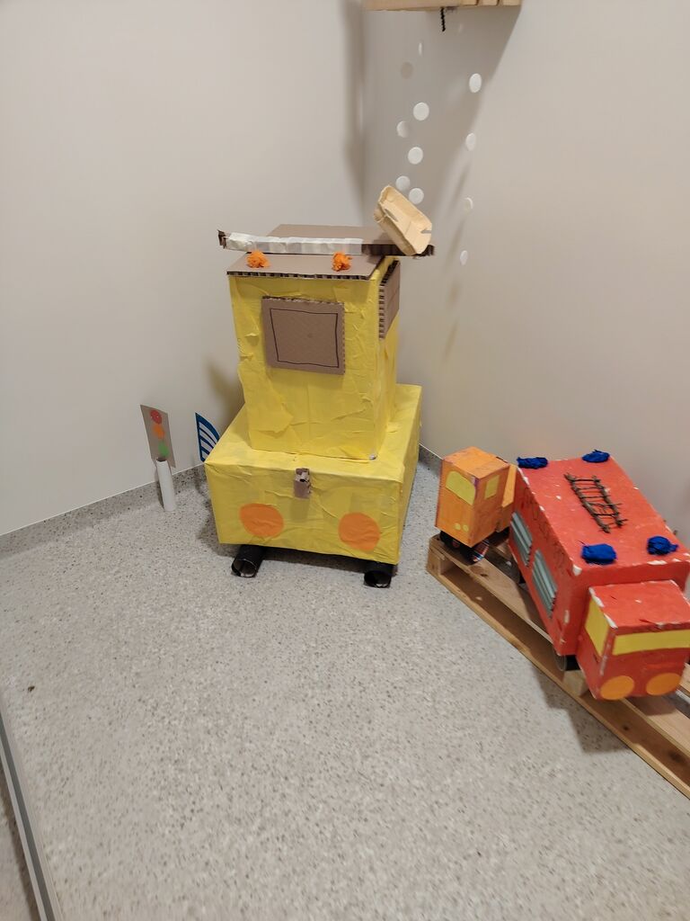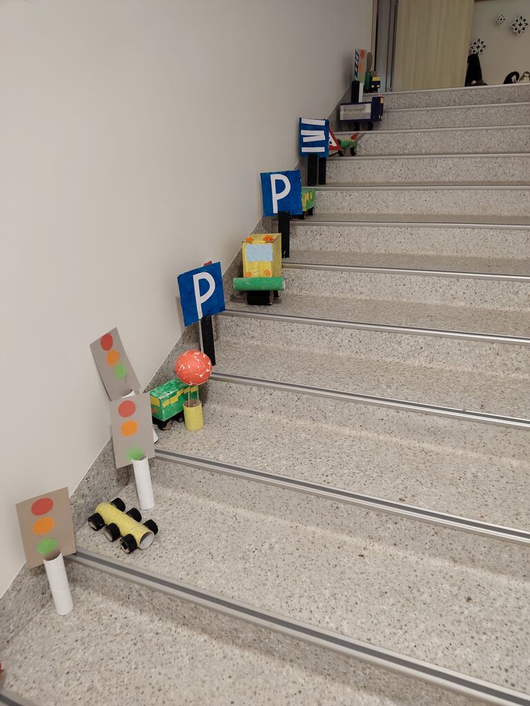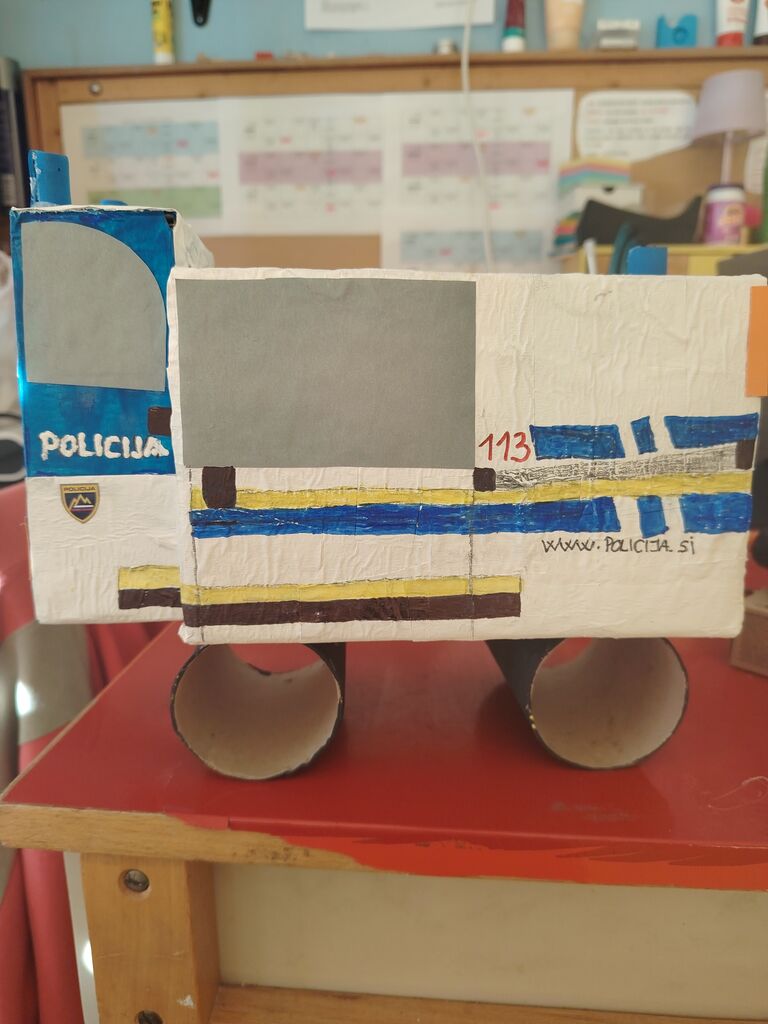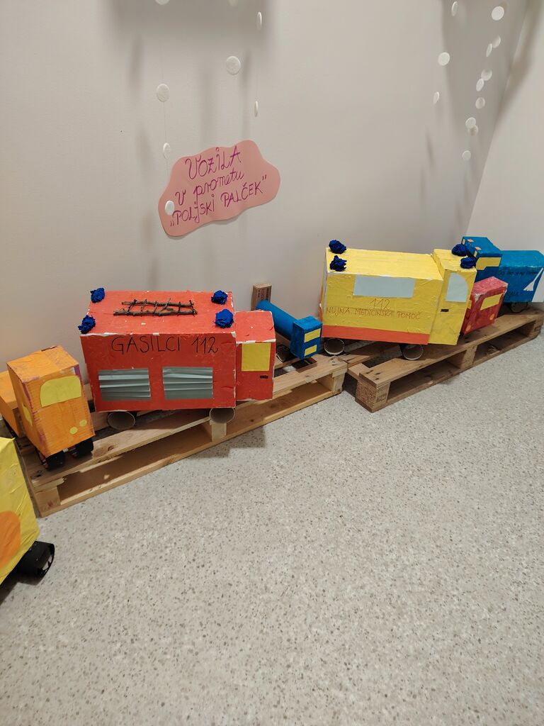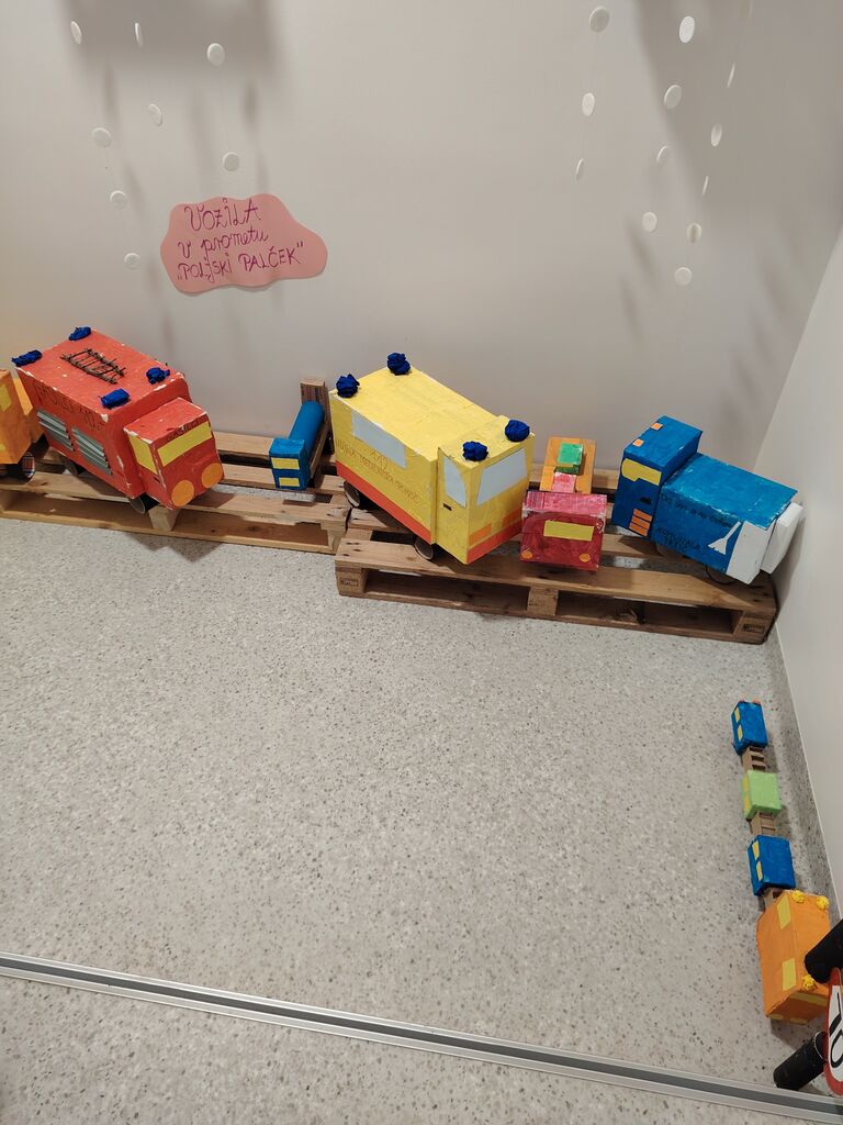Starše sva prosili, da nam otroci od doma v vrtec prinesejo odpadne škatlice, tulce in ostali odpadni material. Tako smo se lotili izdelovanja vozil z uporabo različnih tehnik. Izdelke smo razstavili na podestu in stopnicah naše enote, po zaključku projekta pa uporabili za igro.