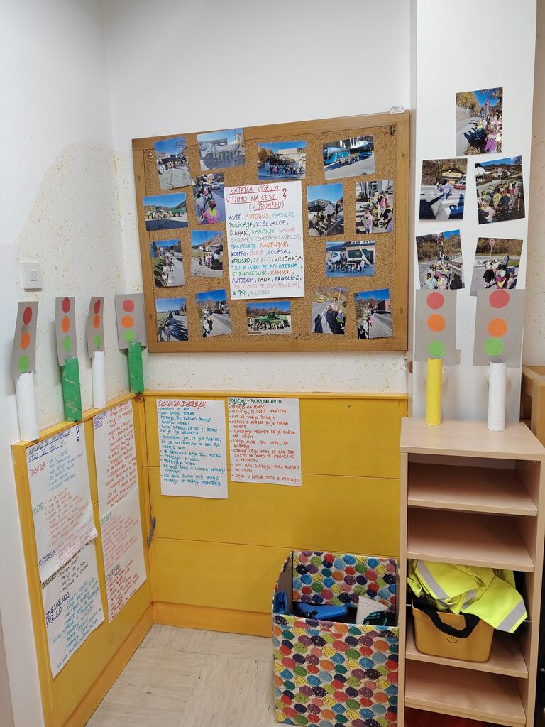 Spoznavali smo promet in prometna pravila. Skozi igro smo prepoznavali prometne znake, jih risali, izdelovali iz odpadnega materiala in opazovali na sprehodih. Najbolj jih je navdušil STOP znak, znak KAMENJE PADA, znak prehod za pešce in seveda SAMOFOR. Pri tem smo se učili in utrjevali tudi oblike (krog, trikotnik in kvadrat) in barve.