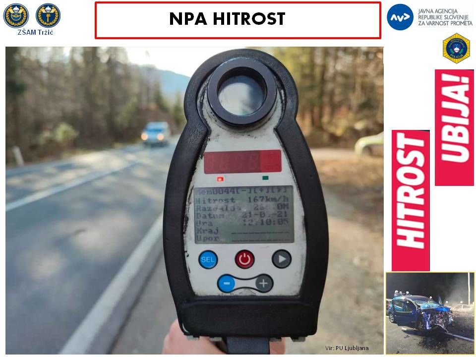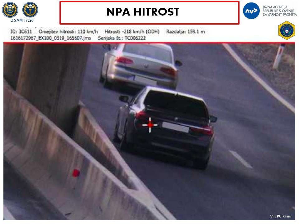 - na območju PU Kranj so na AC obravnavali dva voznika, ki sta drug za drugim na mestu, kjer je omejitev 110 km/h, vozila s hitrostjo 218 km/h.