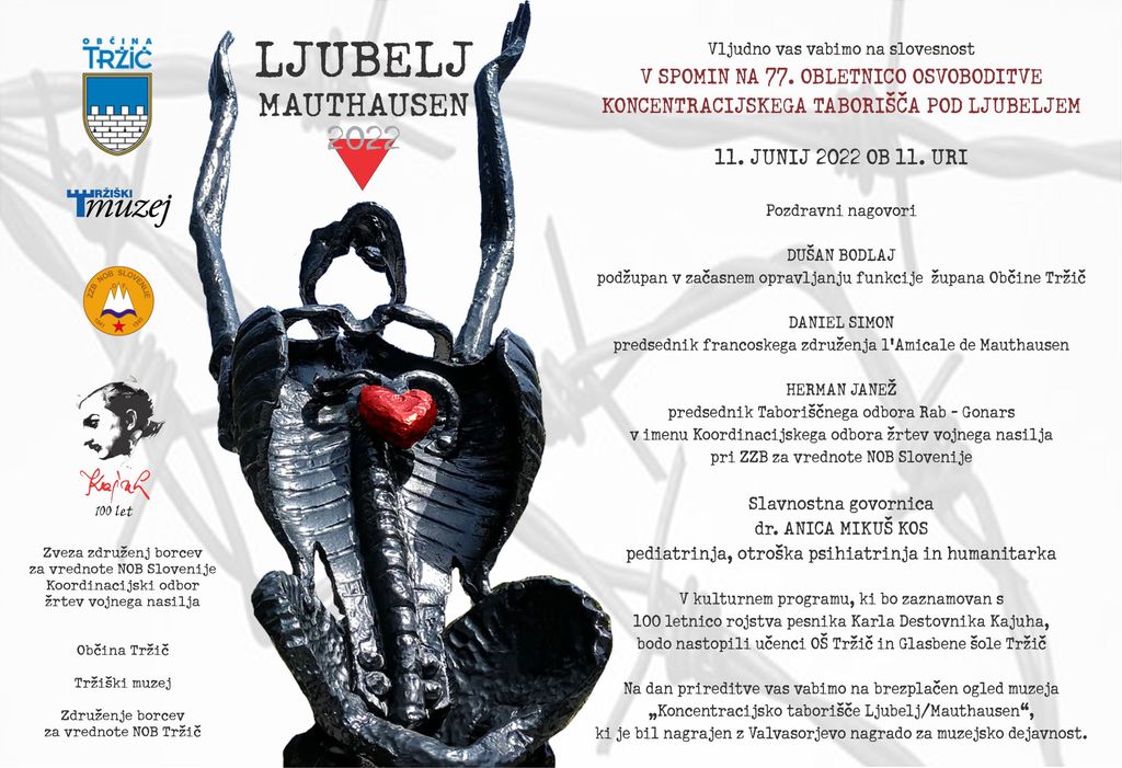 V soboto, 11. junija 2022, vabljeni na slovesnost ob 77. obletnici osvoboditve taborišča Ljubelj. Slovesnost se bo pričela ob 10.45 s polaganjem vencev delegacij, nato pa bo sledil uradni del s kulturnim programom, ki ga bodo popestrili učenci Osnove in glasbene šole Tržič. Slavnostna govornica bo pediatrinja, otroška psihiatrinja in humanistka Anica Mikuš Kos, pozdravne nagovore pa bodo imeli Dušan Bodlaj, podžupan v začasnem opravljanju funkcije župana Občine Tržič, Daniel Simon, predsednik francoskega Društva internirancev iz Mauthausna in Herman Janež, predsednik Taboriščnega odbora Rab – Gonars v imenu Koordinacijskega odbora žrtev vojnega nasilja pri ZZB za vrednote NOB Slovenije.