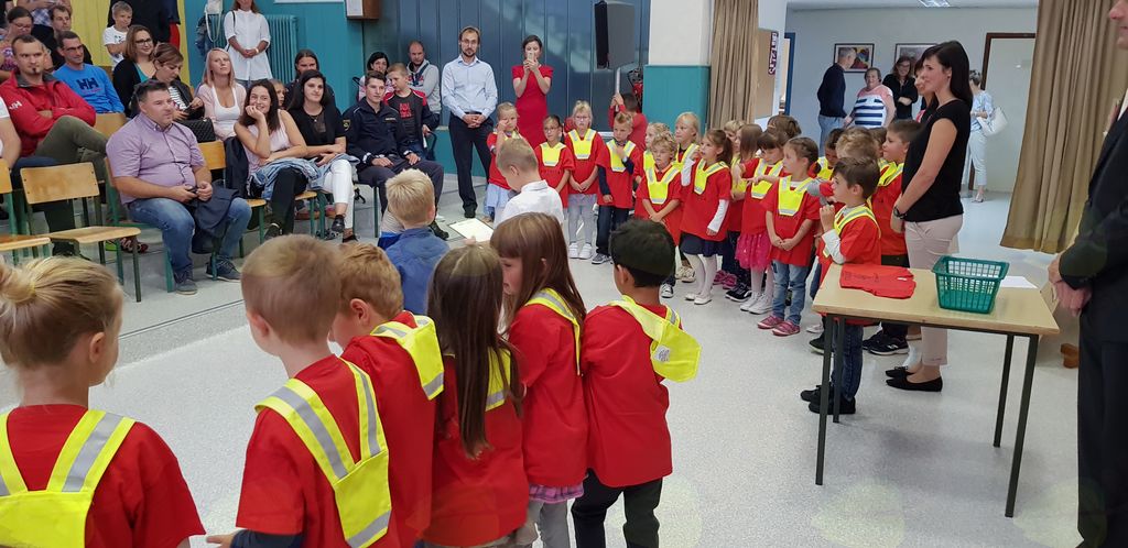 Na sprejemu so bili prisotni tudi policisti iz PP Tržič, ki so prvošolčke še posebej opozorili na varnost, pomembnost nošenja rumenih rutk, na dostop do šole, starše pa na previdno in preudarno vožnjo.