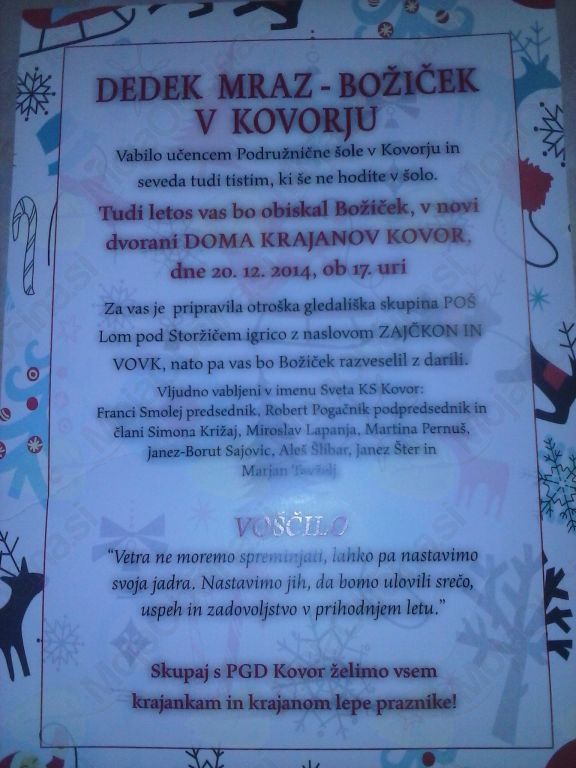 V Kovorju, bosta letos Dedek mraz in Božiček podarila najmlajšim poleg običajnih daril in igrice še posebno darilo - prav za najmlajše se bodo prvič odprla vrata novega Doma krajanov Kovor.