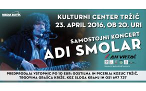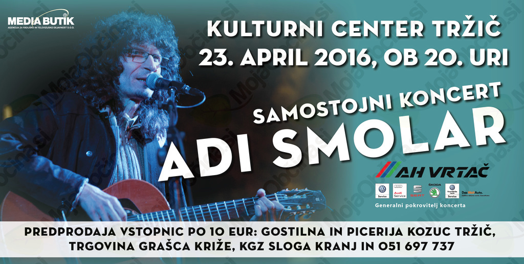 Agencija Media butik vas vabi na samostojni koncert ADIJA SMOLARJA, ki ga za vas pripravljamo v soboto, 23. aprila 2016, ob 20. uri v dvorani Kulturnega centra Tržič.VSAK OBISKOVALEC OB VHODU PREJME BREZPLAČNO ADIJEVO ZGOŠČENKO.