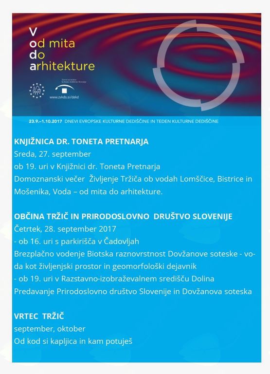 V Knjižnici dr. Toneta Pretnarja so zbirali podatke o pomenu vode, mlinov, žag in elektrarn, kopališč, korit, ki so oblikovali vsakdanje življenje tržiških ljudi in razvoj občine. Zbrano gradivo bodo predstavili v sredo, 27. septembra ob 19. uri na domoznanskem večeru z naslovom Življenje Tržiča ob vodah Lomščice, Bistrice in Mošenika, Voda – od mita do arhitekture.