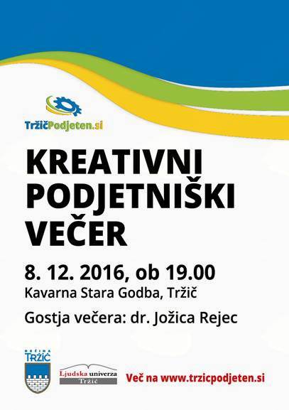 Občina Tržič v sodelovanju z Ljudsko univerzo Tržič v letu 2016 pripravlja niz motivacijskih in aktivacijskih dogodkov za vse, ki se želijo podati na podjetniško pot. Gre za odprte dogodke, ki se jih lahko udeleži vsakdo. Podjetniške večere organiziramo z namenom navdušiti proaktivne posameznike s svežimi in perspektivnimi poslovnimi priložnostmi in podjetniškimi pristopi.