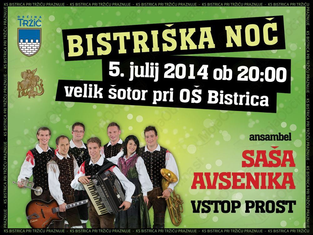 V sklopu praznovanja KS Bistrica pri Tržiču vas vabimo na BISTRIŠKO NOČ, ki bo pod velikim šotorom ob OŠ Bistrica pri Tržiču v soboto, 5. julija 2014, ob 20. uri. Ob prijateljskem srečanju s podelitvijo priznanj krajevne skupnosti bo za zabavo in ples skrbel Ansambel SAŠA AVSENIKA. Vstop je prost.