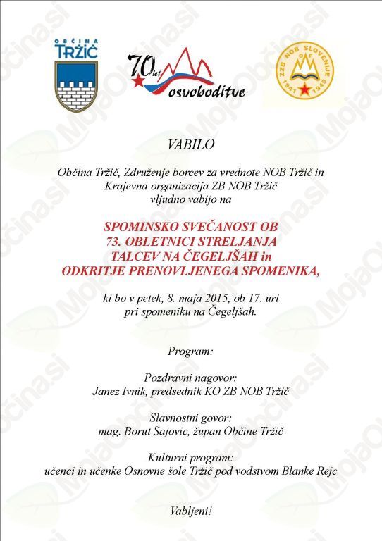 Občina Tržič, Združenje borcev za vrednote NOB Tržič in Krajevna organizacija ZB NOB Tržič vljudno vabijo na SPOMINSKO SVEČANOST OB 73. OBLETNICI STRELJANJA TALCEV NA ČEGELJŠAH in ODKRITJE PRENOVLJENEGA SPOMENIKA, ki bo v petek, 8. maja 2015, ob 17. uri pri spomeniku na Čegeljšah.