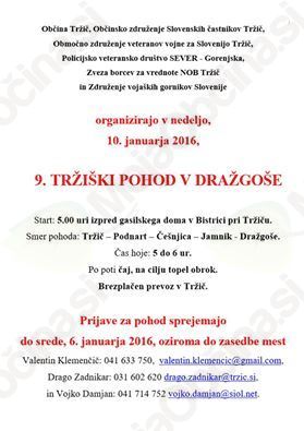 Zbor pohodnikov je ob 5. uri pred Gasilskim domom v Bistrici pri Tržiču. Pohod bo potekal na relaciji Tržič – Podnart – Češnjica – Jamnik - Dražgoše. Hoje bo za 5 do 6 ur, odvisno od razmer. Prijave sprejemajo do 6. januarja oz. do zasedbe mest.