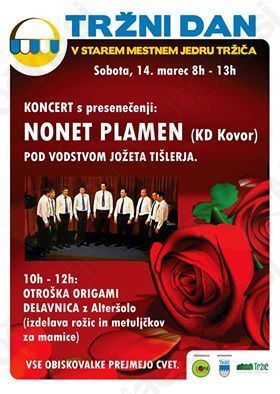 Vabljeni v soboto, 14. marca od 8. do 13. ure na tržni dan v straro mestno jedro Tržiča. Poleg programa, ki vam ga je pripravil nonet Plamen, še Damjana Škantar s kaligrafijo, ter otroška ORIGAMI delavnica z Alteršolo. Na svoji stojnice se bodo predstravili tržiški taborniki.