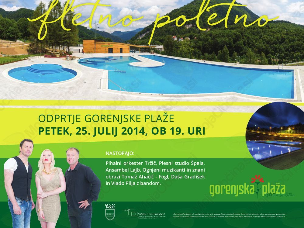 V petek, 25. julija 2014, ob 19. uri pa bo tudi URADNO ODPRTJE GORENJSKE PLAŽE Z ZABAVNO GLASBENIM PROGRAMOM. V njem bodo sodelovali Pihalni orkester Tržič, Plesni studio Špela, ansambel Lajb, Ognjeni muzikanti, od 22. do 01. ure pa bodo obiskovalce v živo zabavali znani obrazi iz tv šova Tomaž Ahačič, Daša Gradiše in Vlado Pilja z bandom. Lačni in žejni ne boste, zabavali pa se boste lahko do zgodnjih sobotnih ur. Vstop na prireditev je prost. Bazenski del pa bo na dan odprtja objekta odprt do 16. ure. Naj bo Gorenjska plaža prostor, kjer se bomo radi in pogosto srečevali.