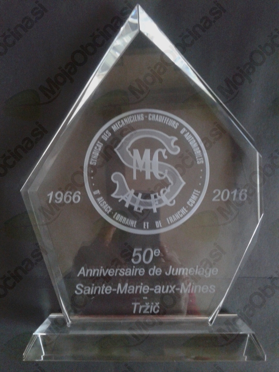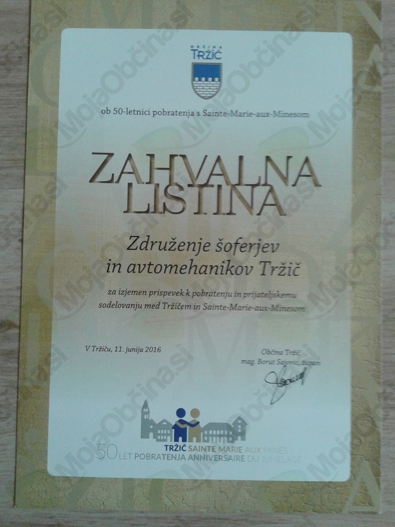 V soboto, 11. junija 2016 nam je Občina Tržič na dogodku ob praznovanju 50-letnice pobratenja s francoskim mestom Sainte-Marie-aux-Mines, podelila priznanje v obliki Zahvalne listine za izjemen prispevek k pobratenju in prijateljskem sodelovanju med Tržičem in Sainte-Marie-aux-Mines.