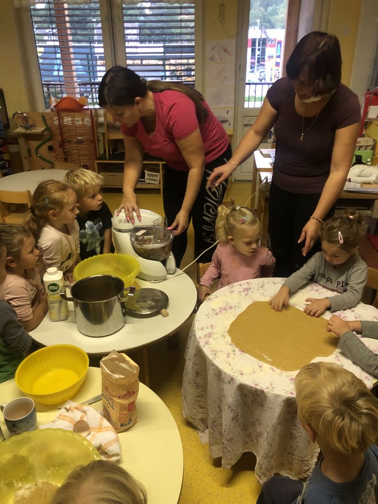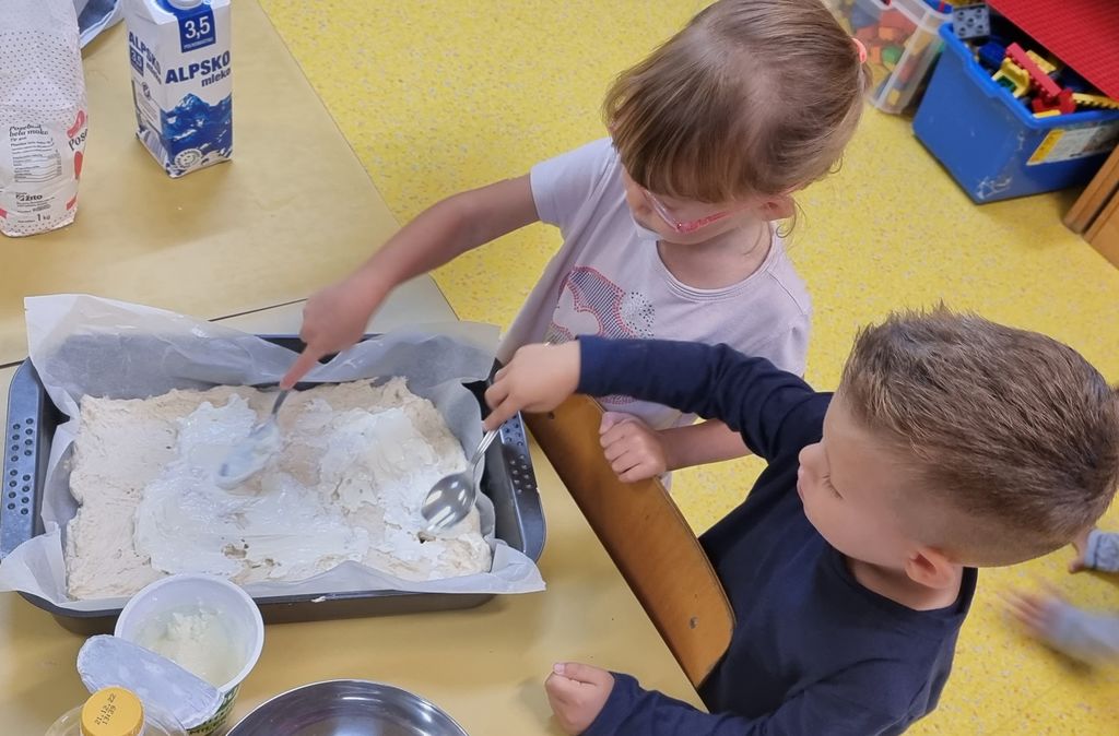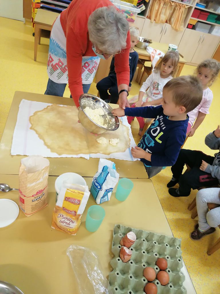 V okviru teme Kaj diši? je zadišalo v igralnici pri Povodnem možu. Spoznavali smo hrano in njen nastanek. V oddelek smo povabili urejevalko prostorov, gospo Suzano, in kuharico, gospo Anjo, da sta nam pomagali odkriti recept za okušanje dediščine, povezane z jedmi. Vrtčevsko okolje je vir neustrašnih idej in priložnosti za otroke. Prelevili smo se v prave peke, ustvarili okusno potico in svojim borbončicam privoščili nekaj okusnega. Ker gre ljubezen skozi želodec, pa smo se podali tudi na degustacijo skozi jedi, ki so jih v okviru projekta pripravili otroci ostalih oddelkov enote.