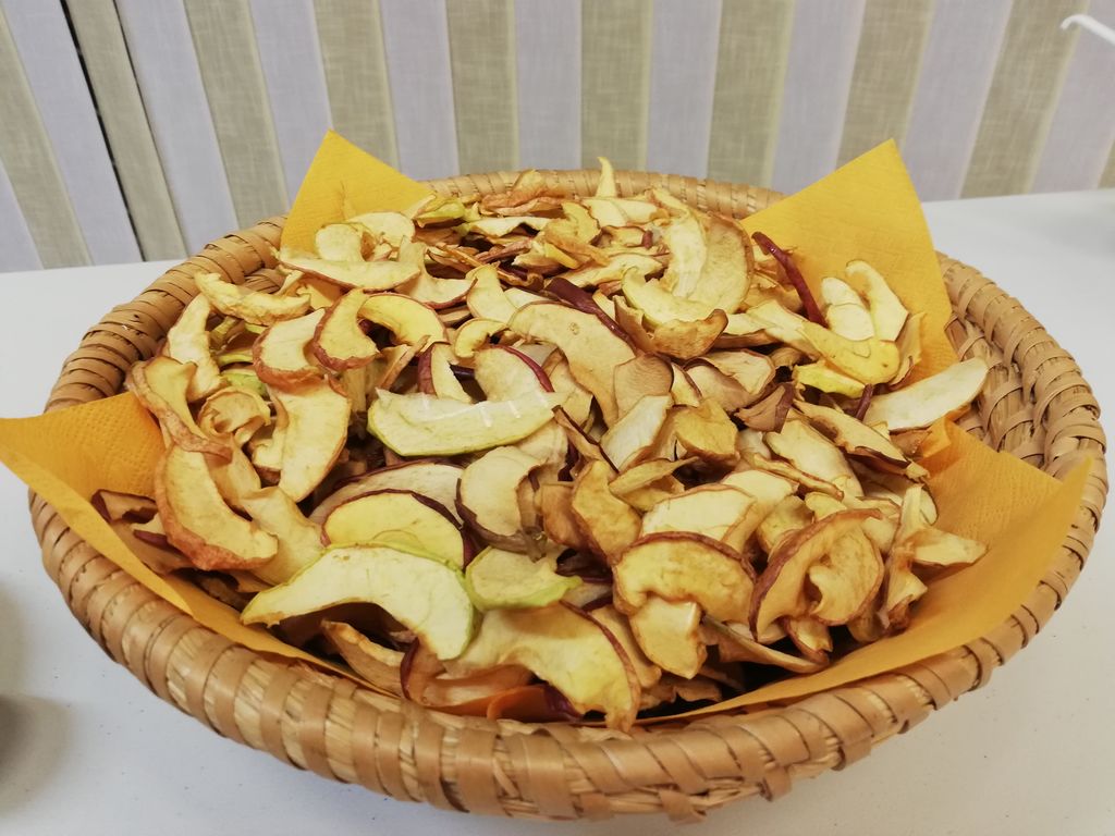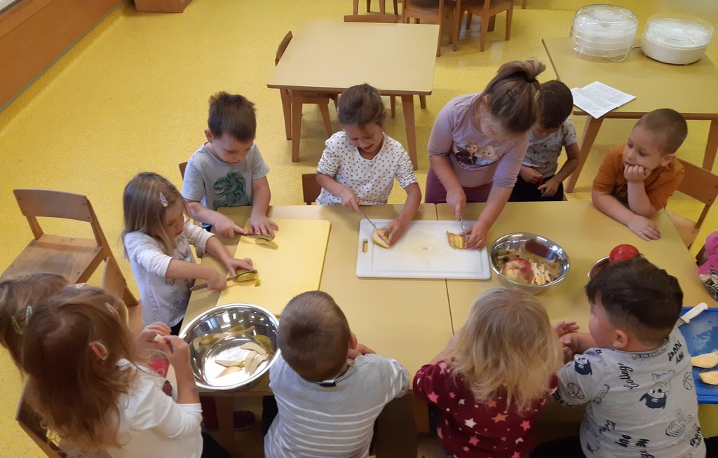 V skupini Pedenjped smo z otroki pripravili suhe jabolčne krhlje. Otroci so aktivno sodelovali skozi celoten postopek. Jabolka so najprej dobro oprali in jih sami, vsak po svojih najboljših močeh, narezali na krhlje in jih zložili v sušilnik sadja. Z zanimanjem so opazovali, kaj se dogaja in kako nam je v igralnici zadišalo. Suhe krhlje smo v peharju odnesli v telovadnico, kjer so jih poskusili tudi ostali otroci.
