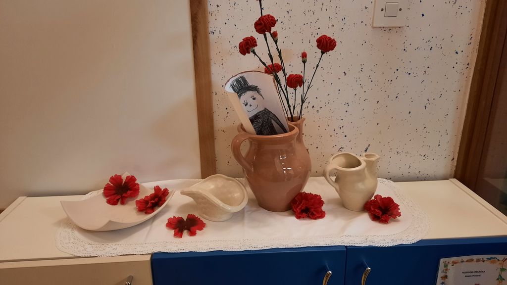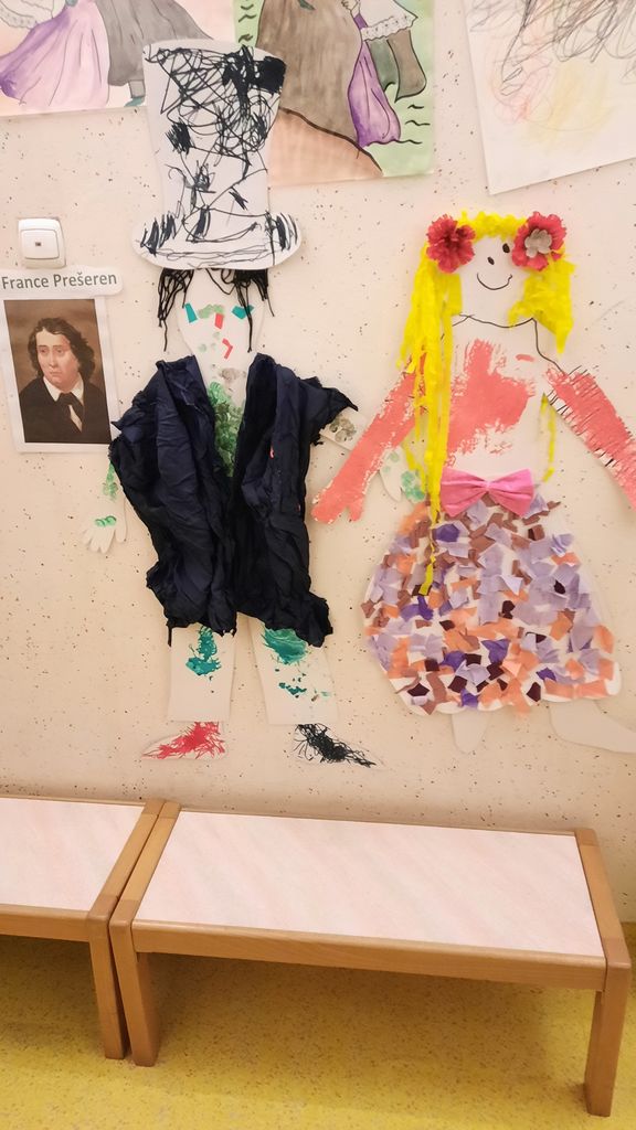 Naša kulturna pot se je pričela tako, da je vsaka izmed igralnic upodobila svojega Povodnega moža in Urško, ki krasijo naše garderobe in prostore pred igralnicami. Preko teh upodobitev so se otroci seznanili z modo tistega časa. Na razstavi o Francetu Prešernu najdemo tudi rdeče nageljne in fige, ki so bile znak našega največjega pesnika. Stene našega vrtca krasi zgodba o Povodnem možu in prav zanimivo se je sprehajati po hodnikih vrtca in opazovati različne in zanimive upodobitve Povodnega moža in Urške. Združili smo učenje z ustvarjanjem in pomembno je bilo, da so otroci ob tem uživali.