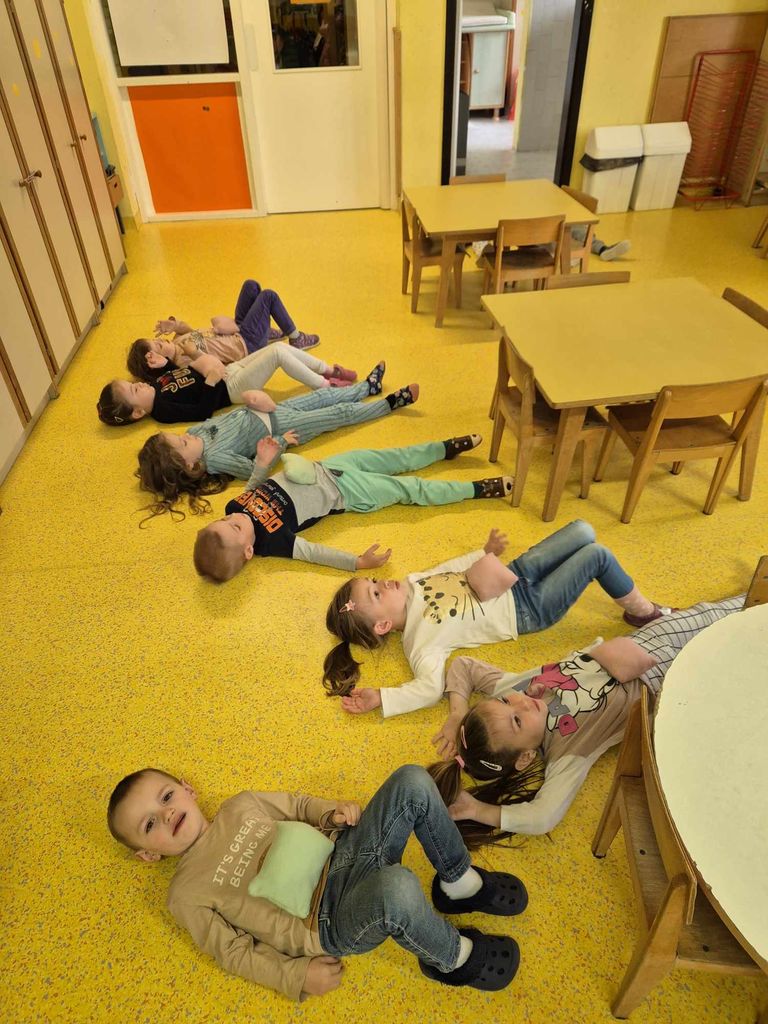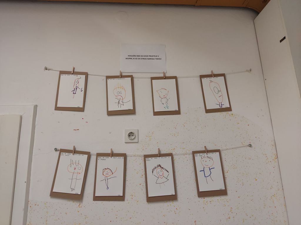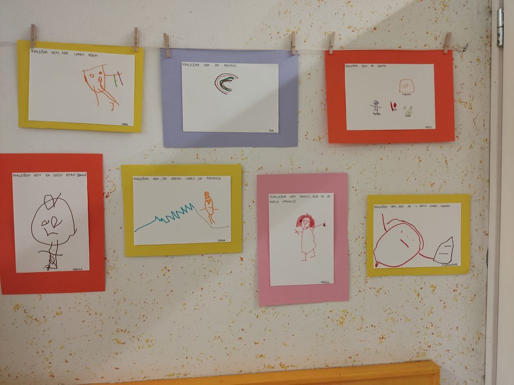 Tako so otroci tekom projekta likovno poustvarjali ob razmišljanju, zakaj so hvaležni, risali so golobe miru in svoje najboljše prijatelje, svoje telo so preko dihalnih vaj znali umiriti in izdelali pripomočke za umirjanje (kozarec za pomiritev, blazinica za umiritev). Prijaznost med otroki sva spodbujali z »vrtom dobrih del«. Ta je iz dneva v dan bolj »cvetel« z dodajanjem nalepk za vsako prijazno dejanje. Kar nekaj dejavnosti smo prenesli v gozd in povezali z gozdno pedagogiko. Iz naravnih materialov so otroci izdelali SOČUTNEGA PALČKA, h kateremu smo se tekom projekta vračali in mu zaupali marsikatero prigodo. Ob koncu projekta so otroci izdelali zapestnice prijateljstva in izkazali skrb za naš planet Zemljo.