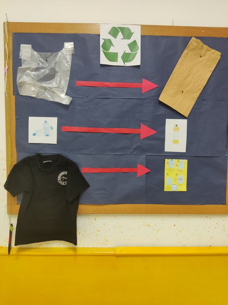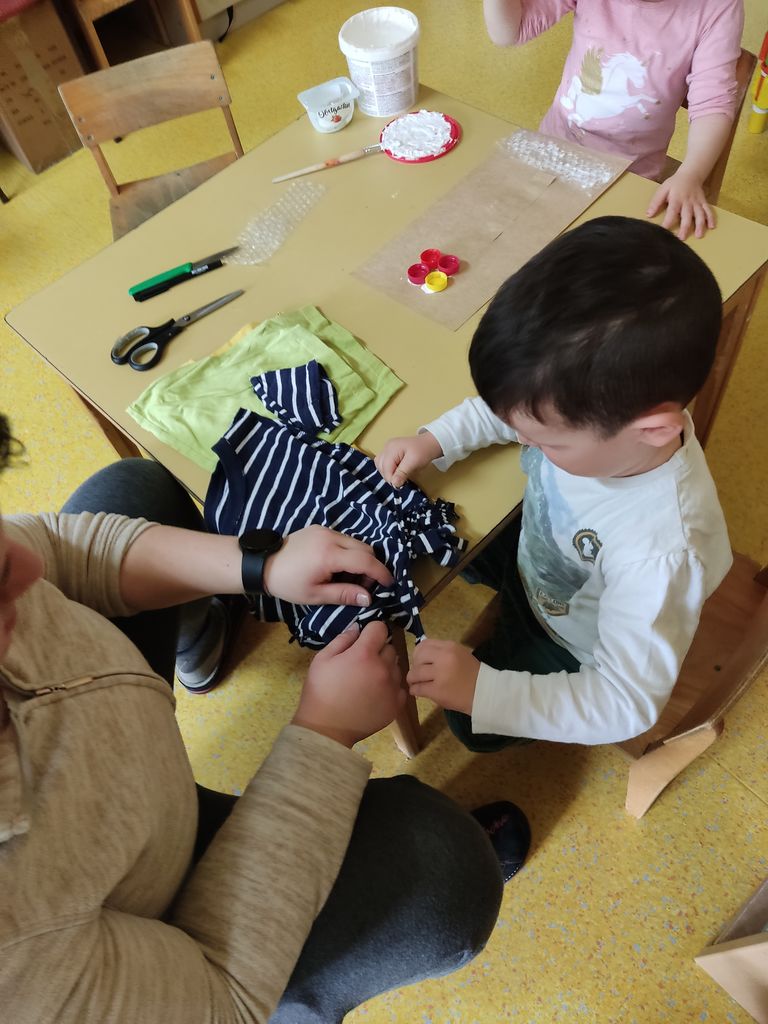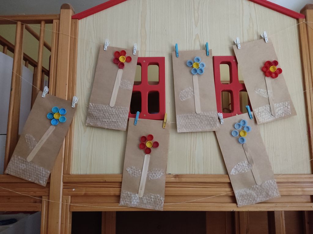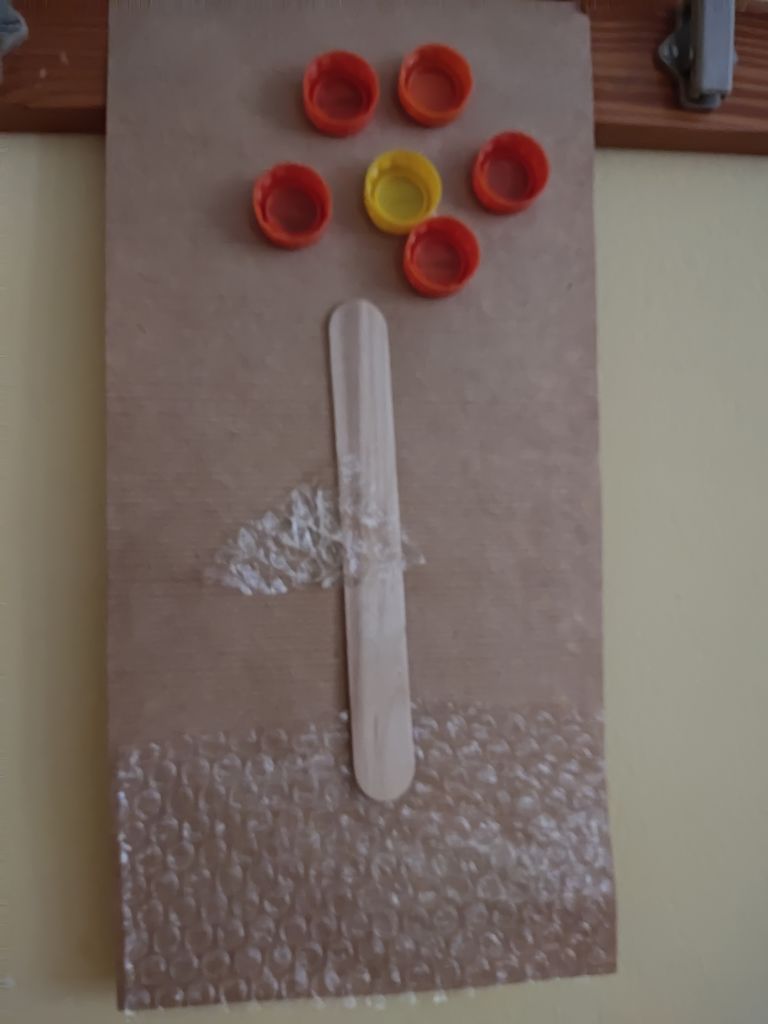 Iz odpadnega materiala smo izdelali SPOMLADANSKE ROŽE za okrasitev igralnice, iz starih majic pa smo izdelali vrečke za umazano perilo. Ob koncu projekta nas je ob svetovnem dnevu Zemlje obiskal smetarski tovornjak Komunale Tržič. Ta je pred enoto izpraznil smetnjake, kar je bilo za otroke prav posebno doživetje.