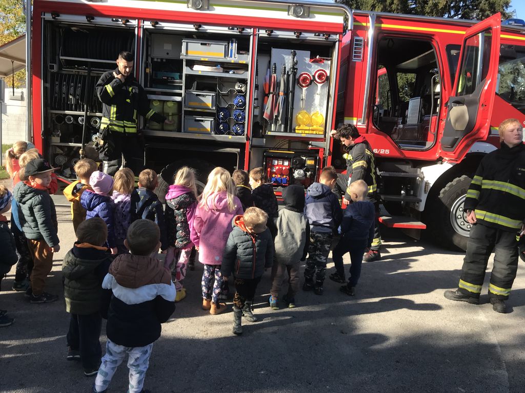 Po vaji pa smo si lahko pobližje ogledali gasilsko opremo, njihov velikanski gasilski tovornjak z vso opremo, manjkala ni niti voda, s pomočjo gasilk smo lahko špricali z vedrvoko, ki pa je ni tako enostavno "pumpati".