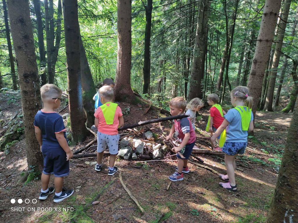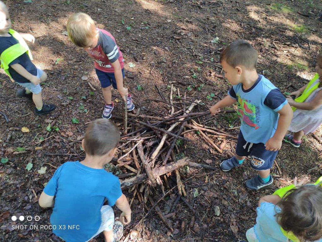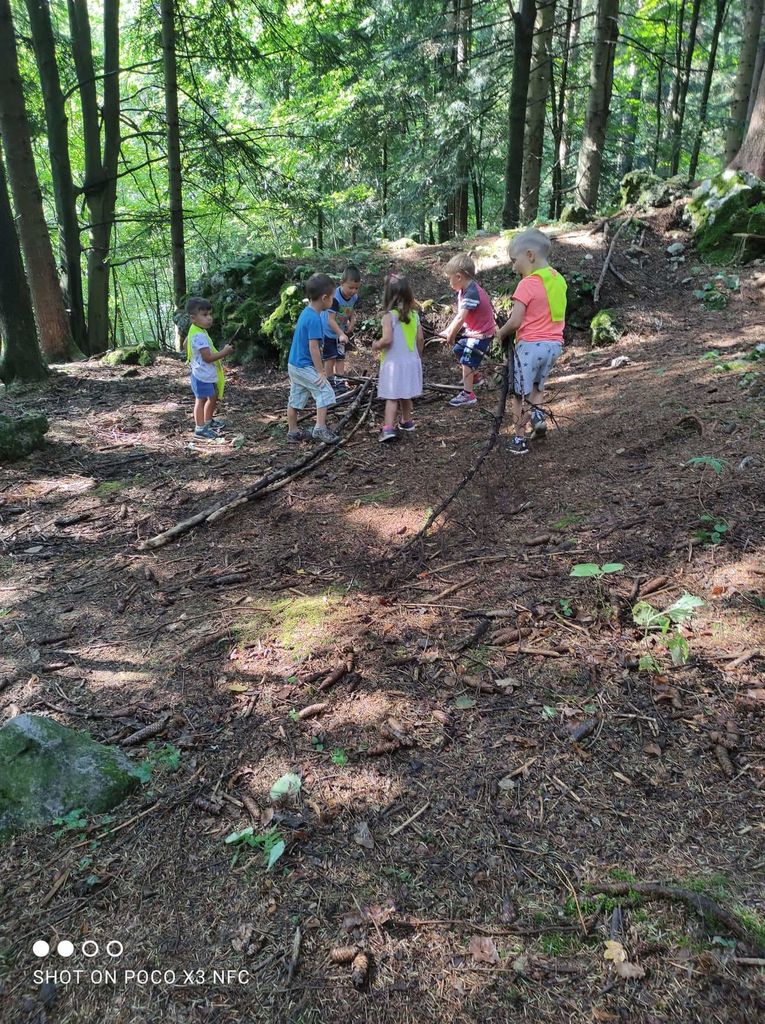 Bližina gozda nas je v enoti Deteljica Vrtca Tržič spodbudila, da se sprehodimo v njegovo zavetje. Na vrtčevskem igrišču smo nabrali različna zelišča, s katerimi so se otroci odišavili in s tem v gozdu odgnali komarje in klope. Otroška brezmejna domišljija je naše otroke pripeljala do gradnje ognjišč iz vej, peke čevapčičev, gašenja ognja in gradnja hišk za živali. Vrnili smo se srečni in z željami po ponovni vrnitvi v gozd.