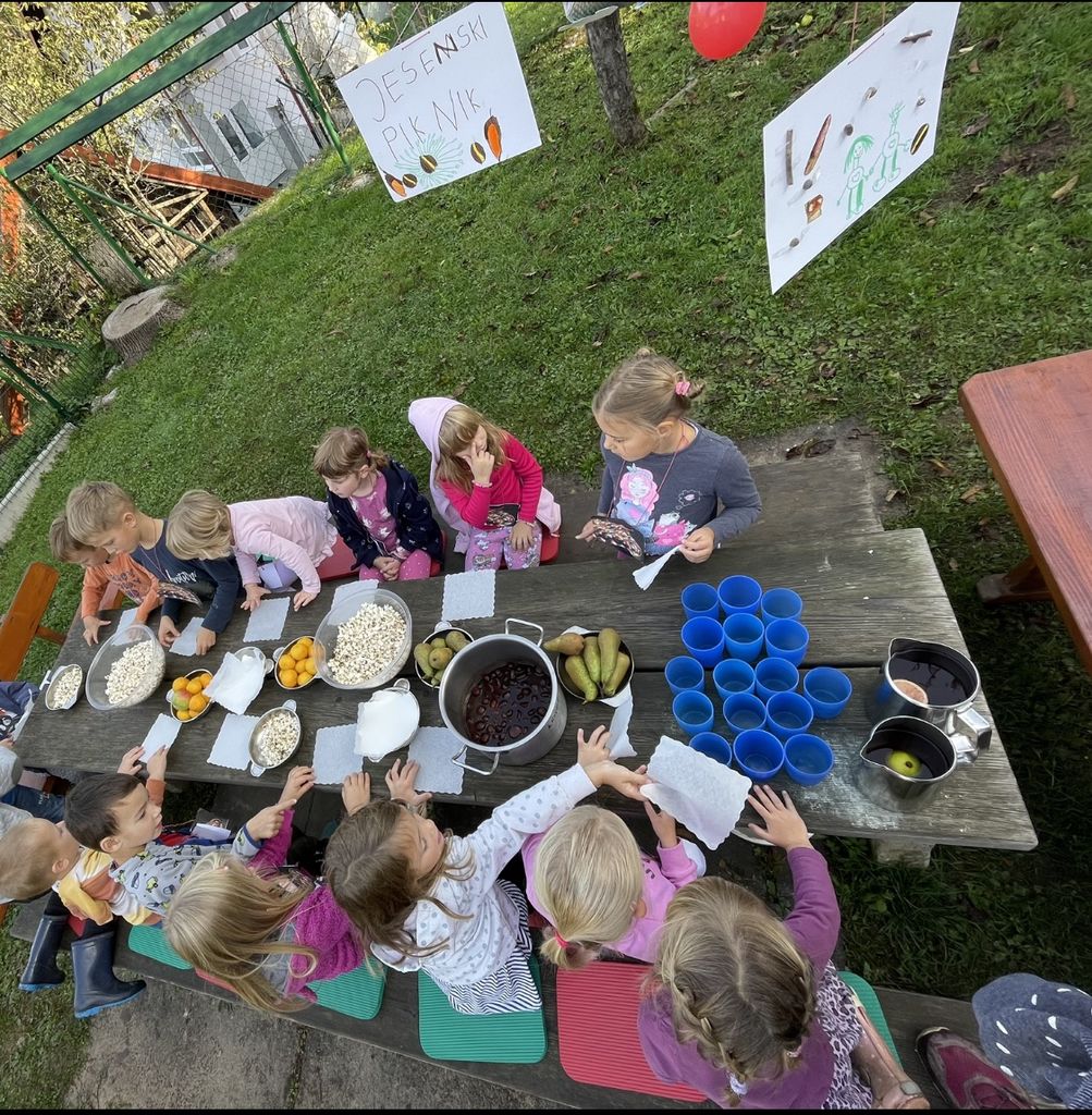 Prek celega tedna smo v oddelku Vrtca Tržič v Lomu veliko pozornosti namenili pogovoru o pikniku in predlogom, kako ga izvesti. Otroci so izrazili želje in skupaj smo izdelali plakat z idejami otrok. Predlogi otrok so bili: piknik na prostem, peka kokic, kuhanje kostanja, priprava »sadne tortice na pladnju«, okrasitev prostora z jesenskimi plodovi in baloni. Realizirali smo načrt in poskrbeli za vse potrebno. Topla jesen nas je povabila na igrišče, kjer so otroci uredili prostor z jesenskimi plodovi, ki so jih predhodno prinesli od doma. Sodelovali smo s kuharico POŠ Lom Mojco Tišler, ki nam je pomagala s pripravo. Prijetno dopoldne smo popestrili s povezovanjem z učenci 1. razreda in skupaj smo razvajali svoje brbončice. Prinesli smo jim pladenj jesenskih dobrot in jim tako privabili nasmeh na obraze. Preživeli smo čudovito, sončno in jesensko obarvano dopoldne. Organizirali smo najbolj slasten jesenski piknik.