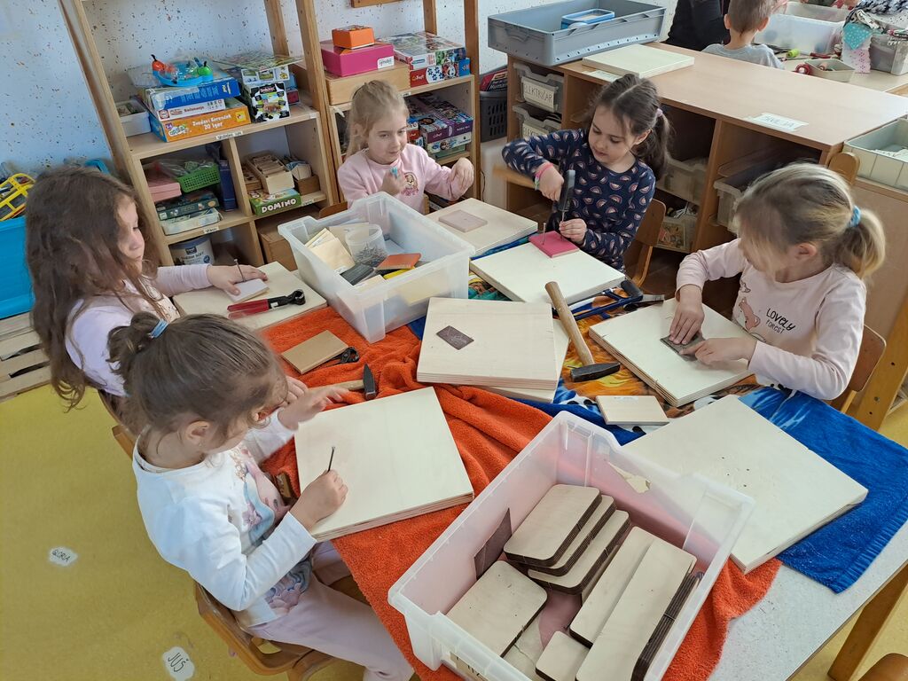 s kladivi, žeblji, kleščami in veliko lesa. Otroci so pri zabijanju neizmerno
