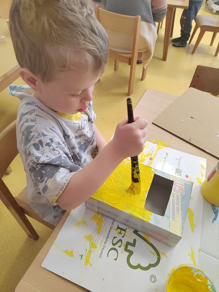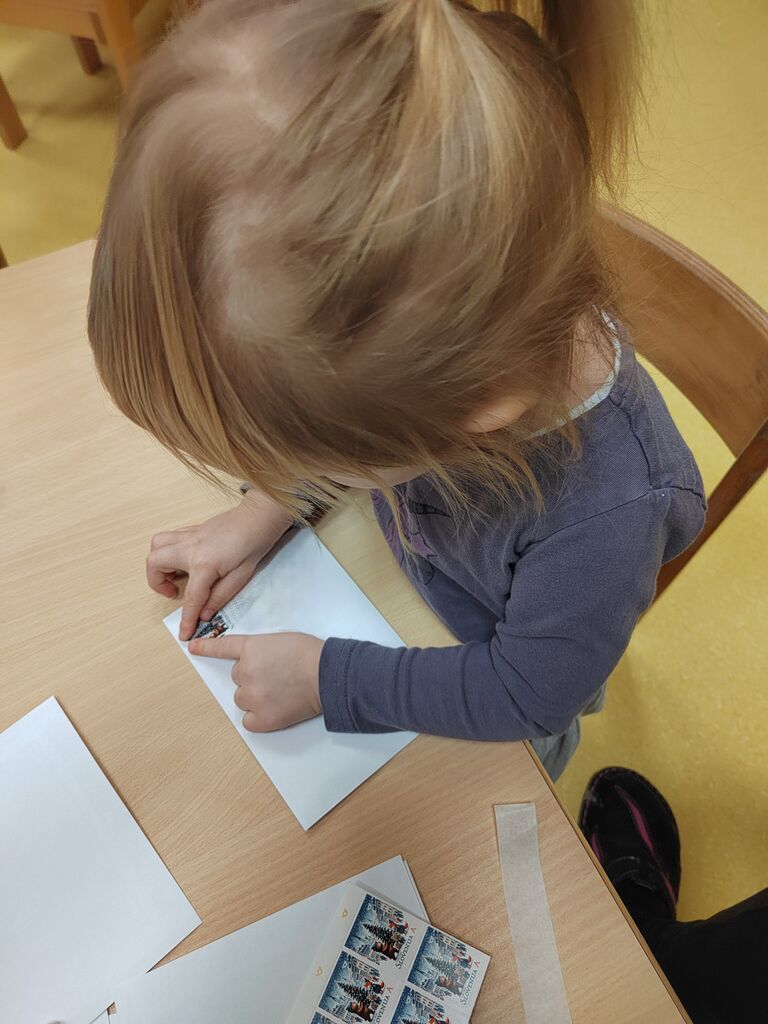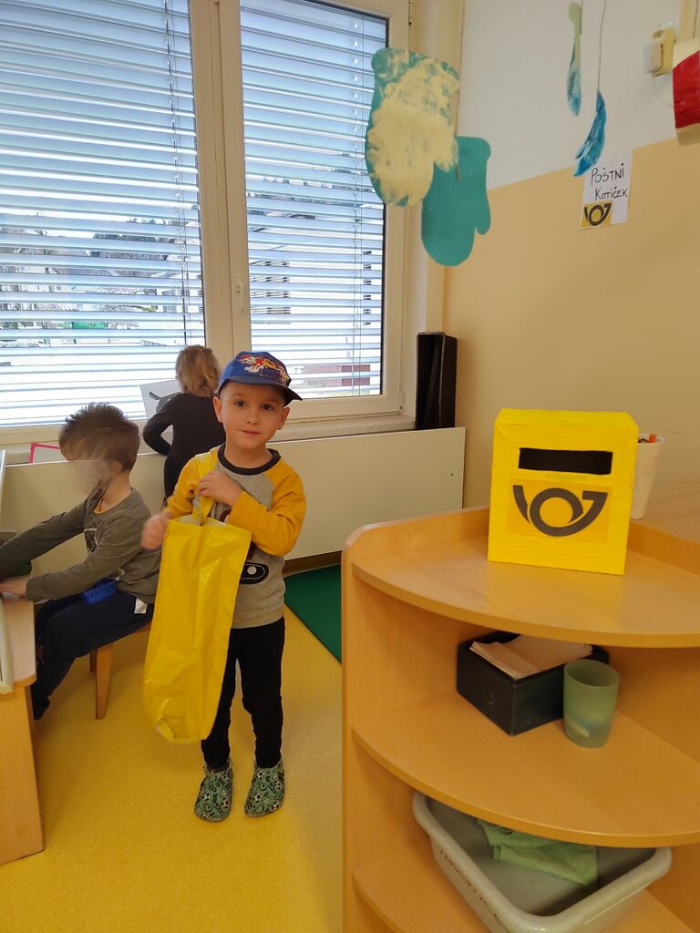 V igralnici smo uredili pravi poštni kotiček, kjer so otroci skozi igro vlog spoznavali poklic poštarja in poštne delavke. Z navdušenjem so razvrščali pisma, reklame in pakete, žigosali kuverte ter jih raznašali po igralnici.