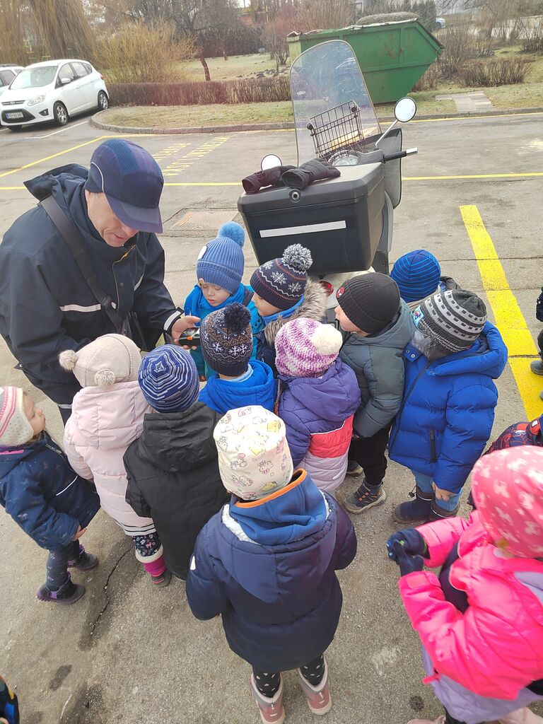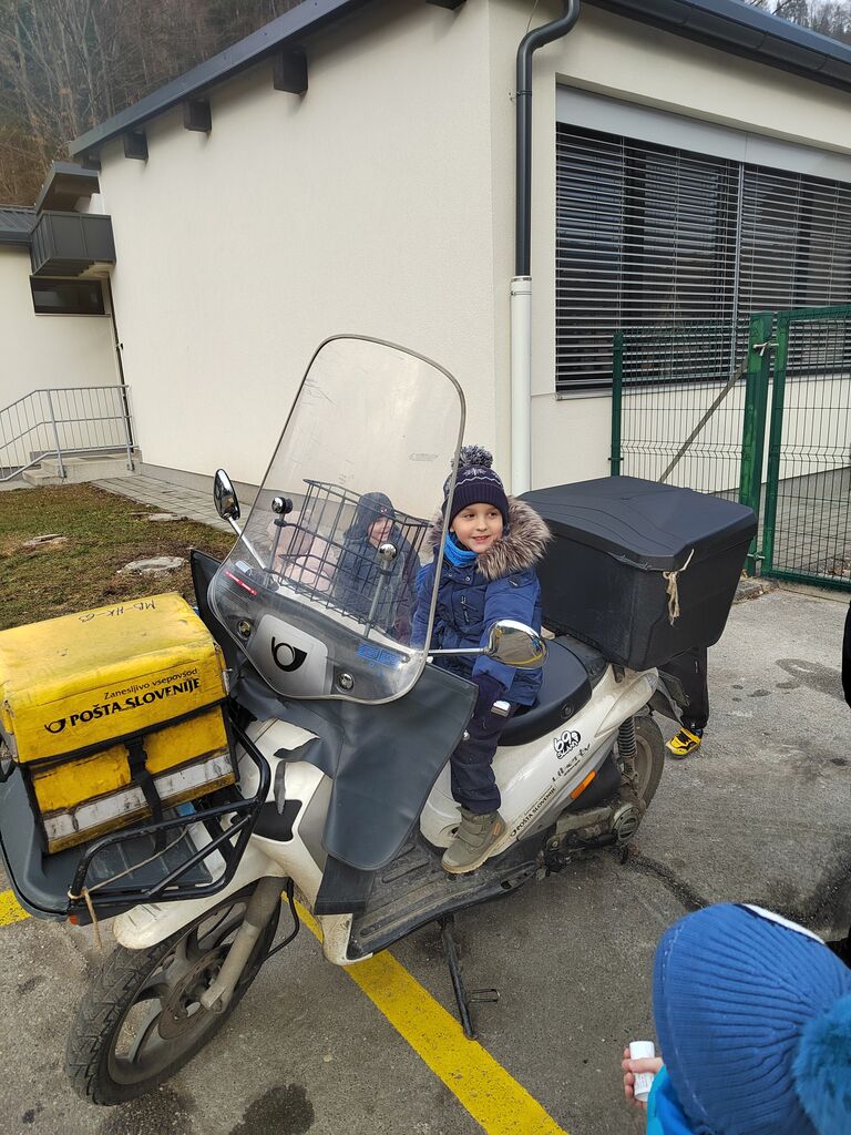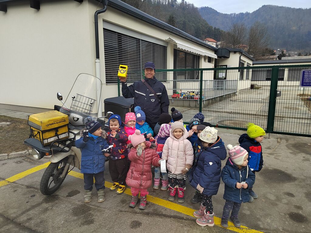 Poseben dogodek je bil obisk poštarja v našem vrtcu. Predstavil nam je svoj poklic, pokazal torbo, uniformo in razložil, kako poteka njegov delovni dan. Otroci so ga z zanimanjem poslušali.