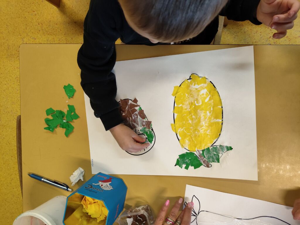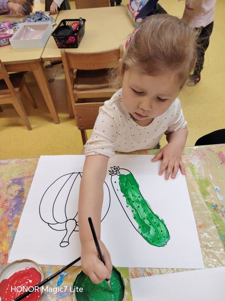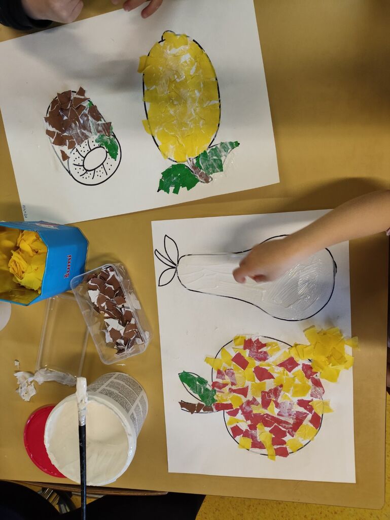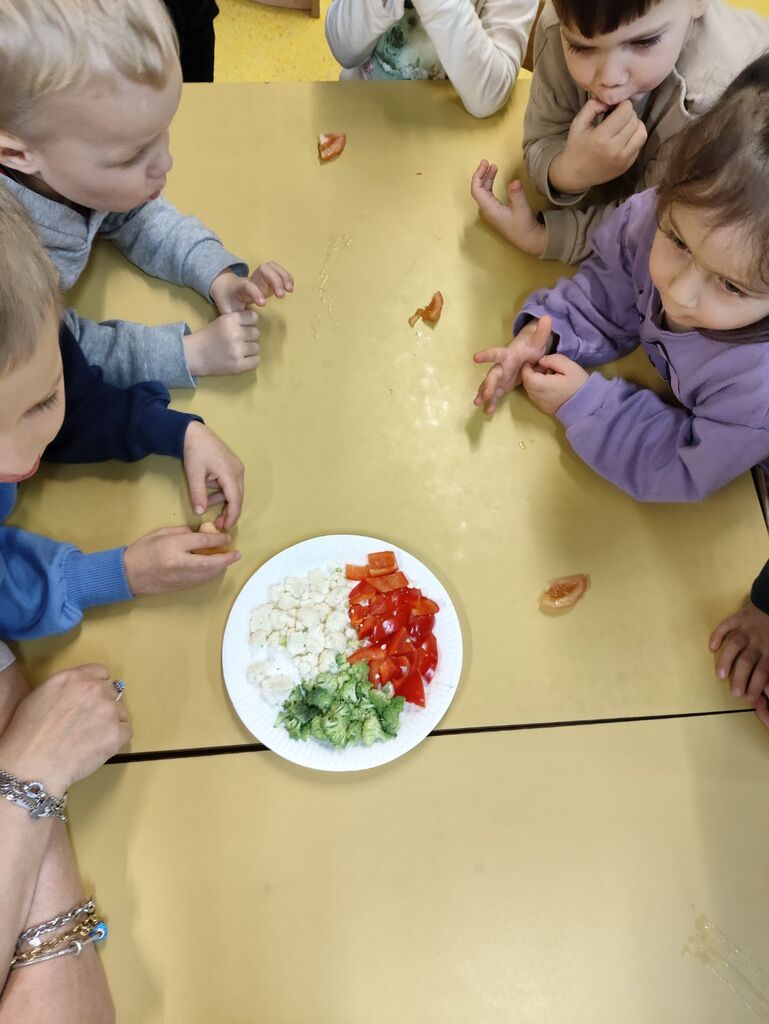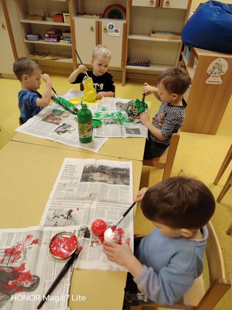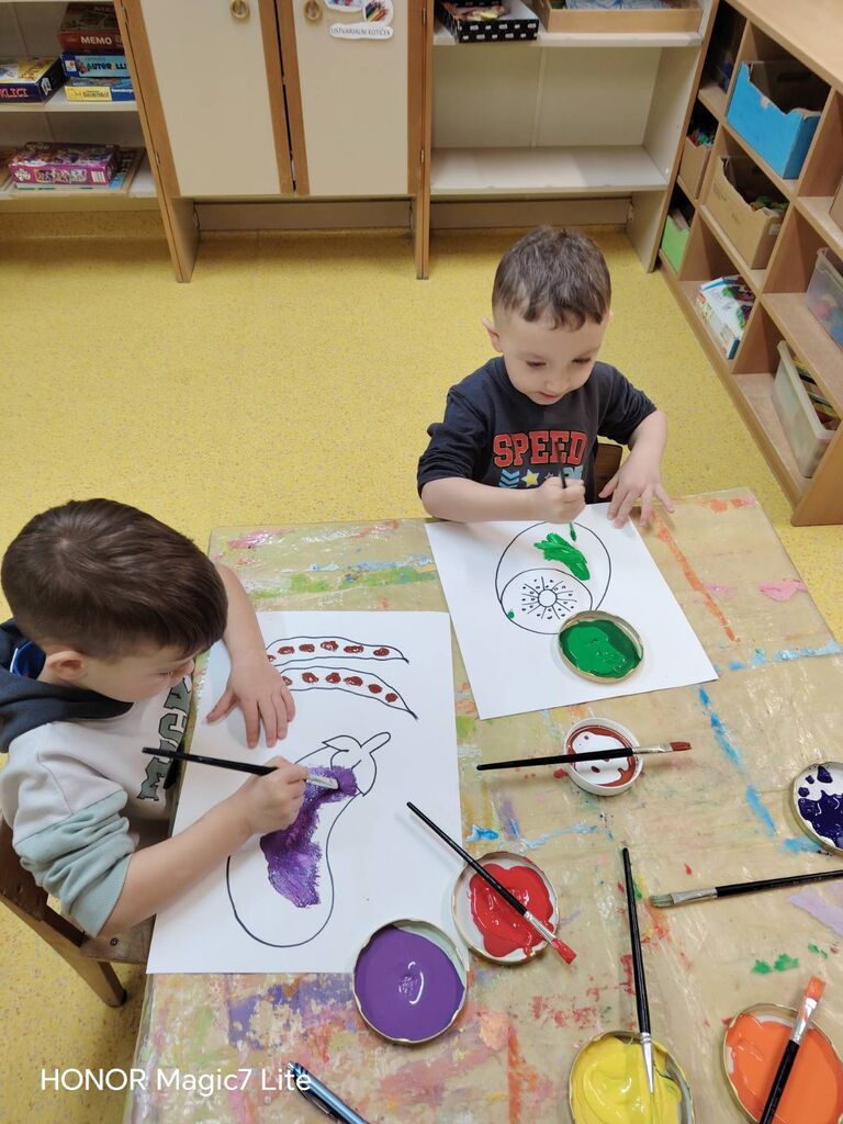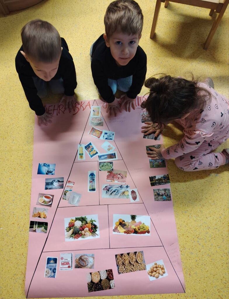 Izdelali smo plakat prehranske piramide ter plakat »Zdrava in ne zdrava hrana«. Otroci so iz reklam izrezovali slike hrane in jih razvrščali glede na to, ali spadajo med zdravo ali nezdravo prehrano. Na to temo smo tudi likovno ustvarjali: barvali smo sadje in zelenjavo, izdelovali trganko ter iz različnega odpadnega materiala ustvarili različne vrste sadja in zelenjave, ki krasijo našo igralnico.
