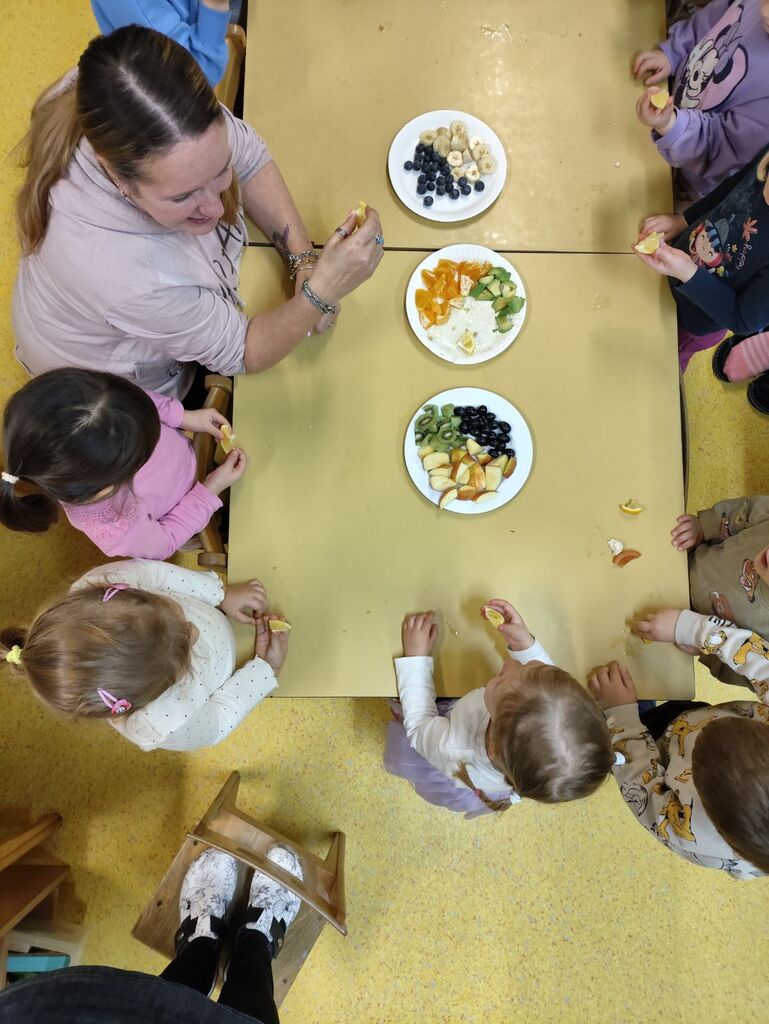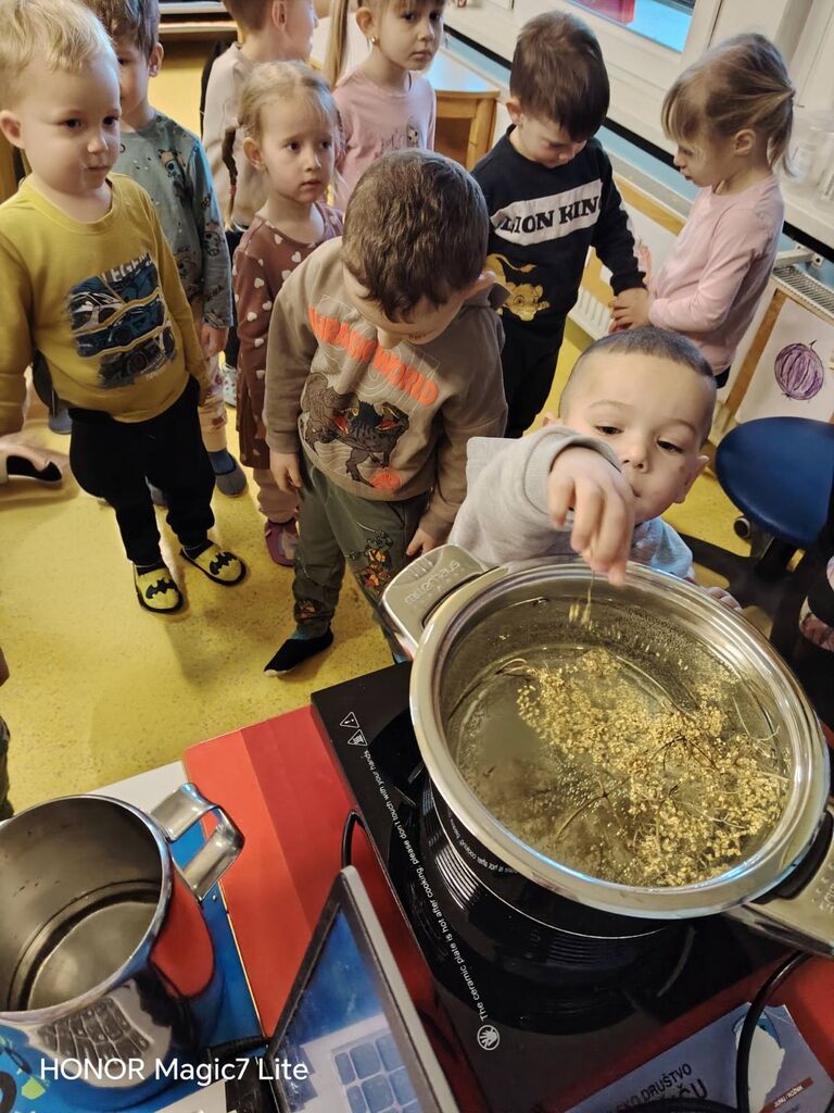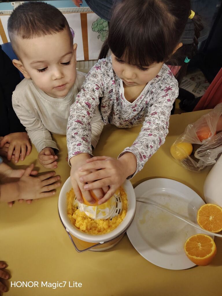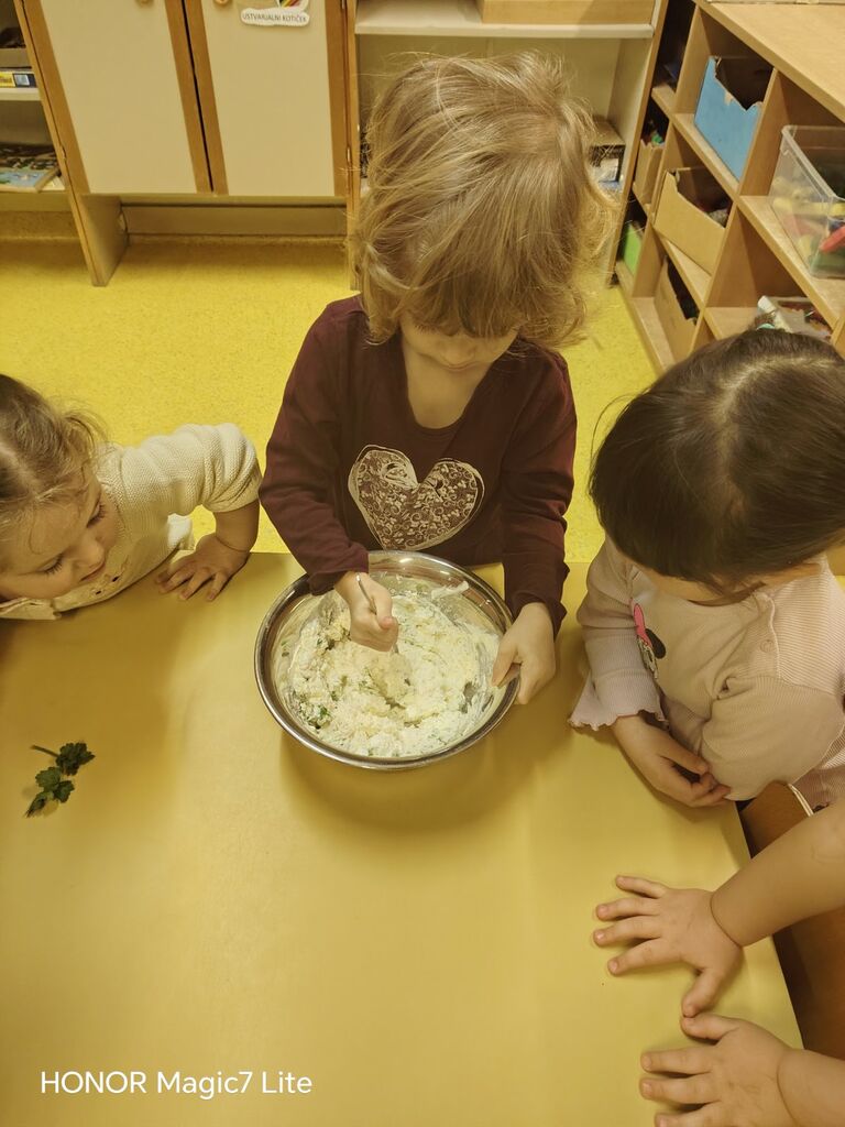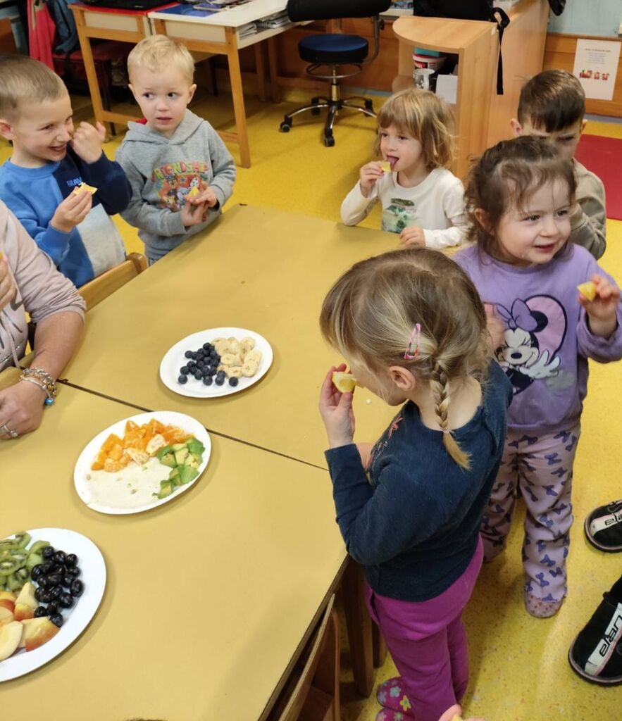 Dotaknili smo se tudi zdrave prehrane. Okušali smo različno sadje in zelenjavo. Najprej smo živila temeljito umili, nato narezali na koščke. Otroci so sadje in zelenjavo najprej potipali, povohali in nato poskusili. Pri tem so uporabljali vsa svoja čutila. Na koncu so povedali, katero sadje in katera zelenjava jim je bila najbolj všeč. Skupaj smo pripravili dva namaza, zeliščnega in iz avokada, ki smo ju pojedli za malico. Z veseljem smo ju ponudili tudi gospe podravnateljici Mojci, ki nas je takrat obiskala. Skuhali smo tudi domači bezgov čaj in pripravili naravni sok iz pomaranč, saj je za zdravje pomembno tudi, da pijemo zadostne količine tekočine.
