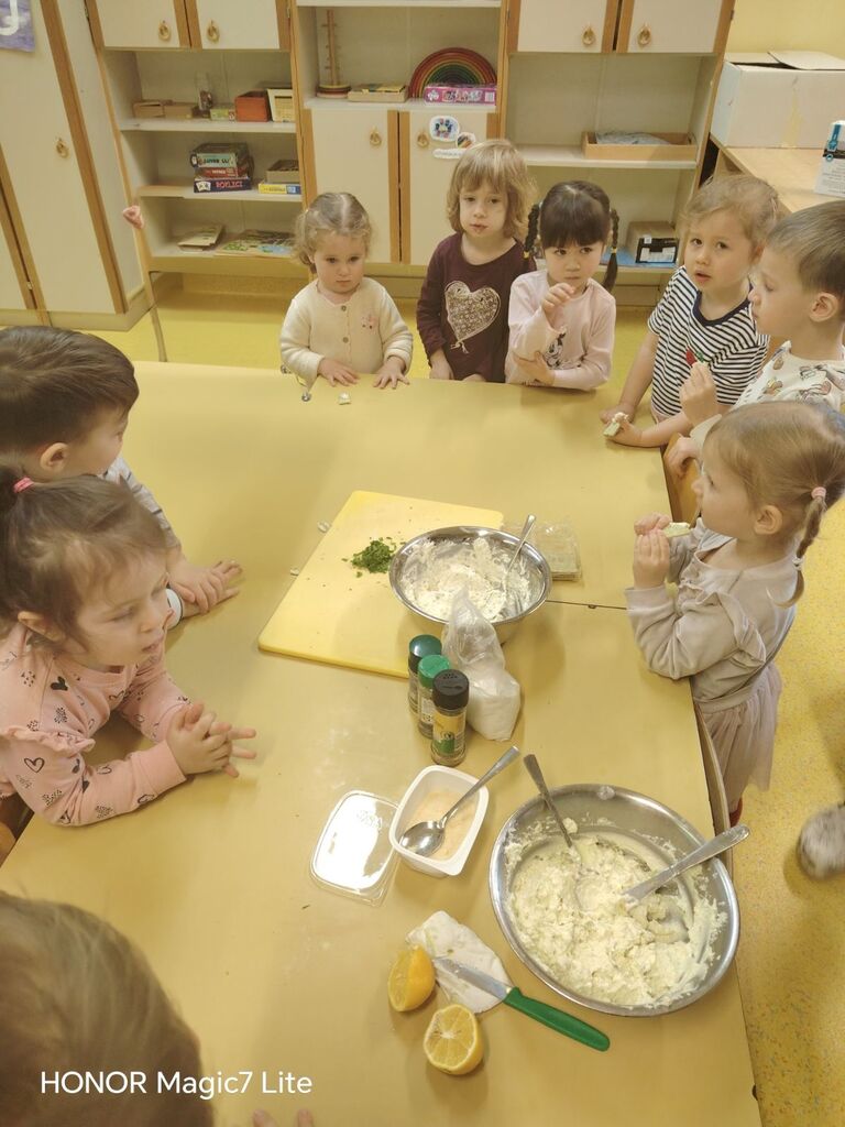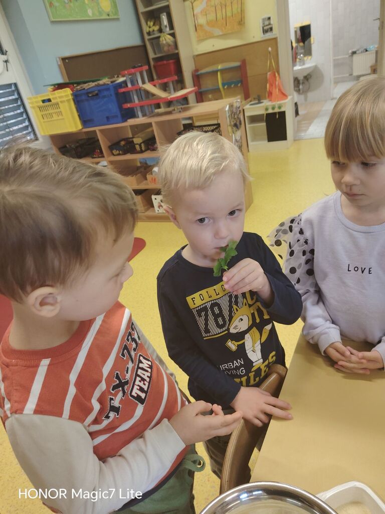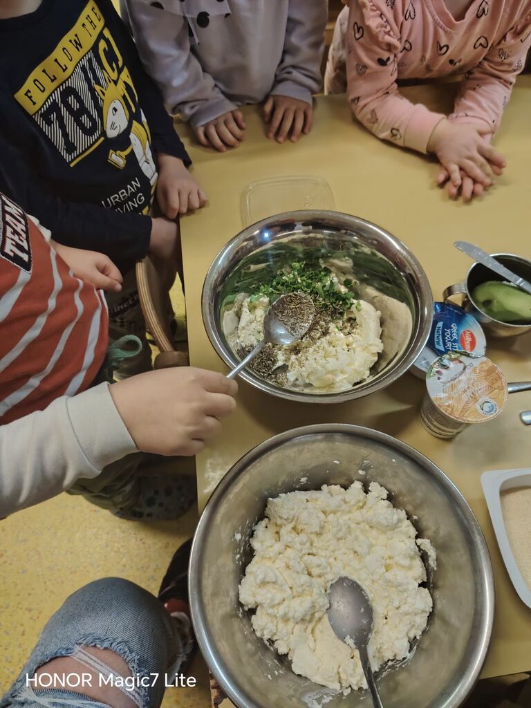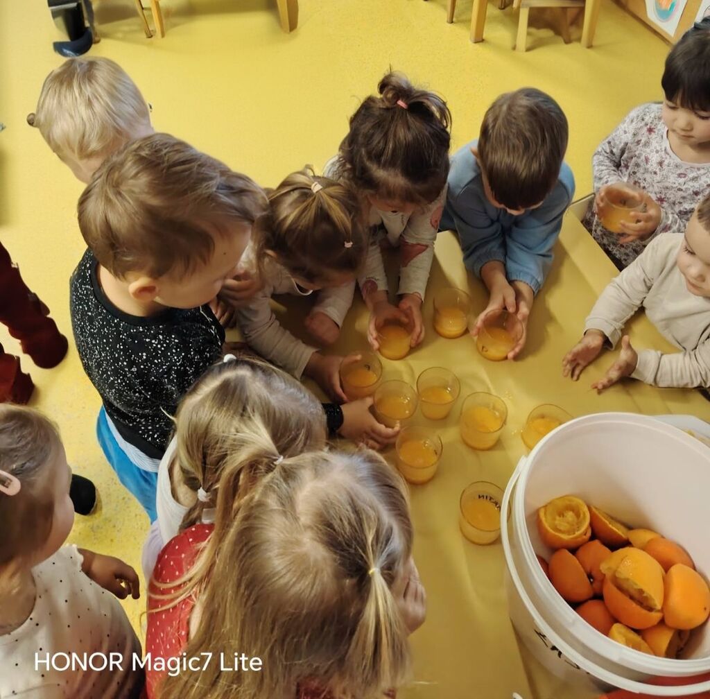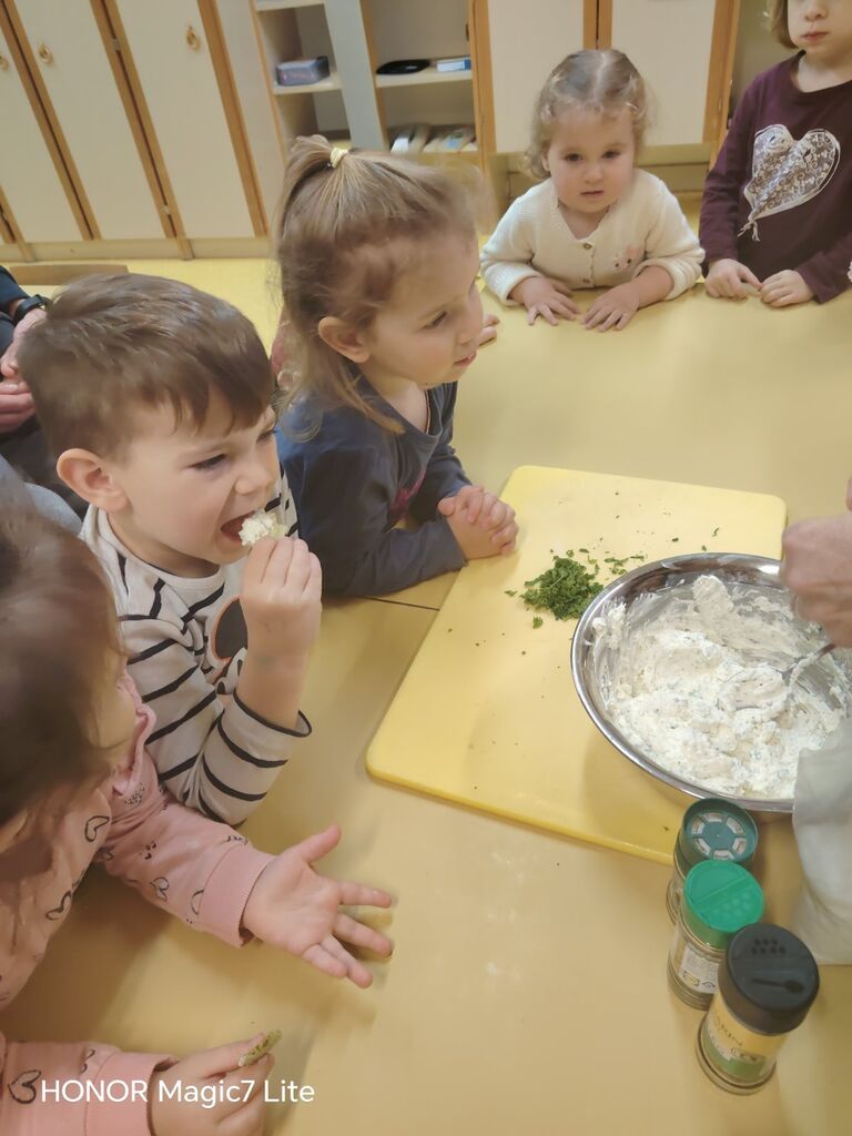 Dotaknili smo se tudi zdrave prehrane. Okušali smo različno sadje in zelenjavo. Najprej smo živila temeljito umili, nato narezali na koščke. Otroci so sadje in zelenjavo najprej potipali, povohali in nato poskusili. Pri tem so uporabljali vsa svoja čutila. Na koncu so povedali, katero sadje in katera zelenjava jim je bila najbolj všeč. Skupaj smo pripravili dva namaza, zeliščnega in iz avokada, ki smo ju pojedli za malico. Z veseljem smo ju ponudili tudi gospe podravnateljici Mojci, ki nas je takrat obiskala. Skuhali smo tudi domači bezgov čaj in pripravili naravni sok iz pomaranč, saj je za zdravje pomembno tudi, da pijemo zadostne količine tekočine.