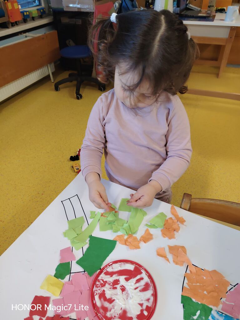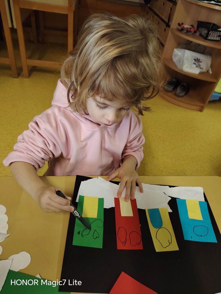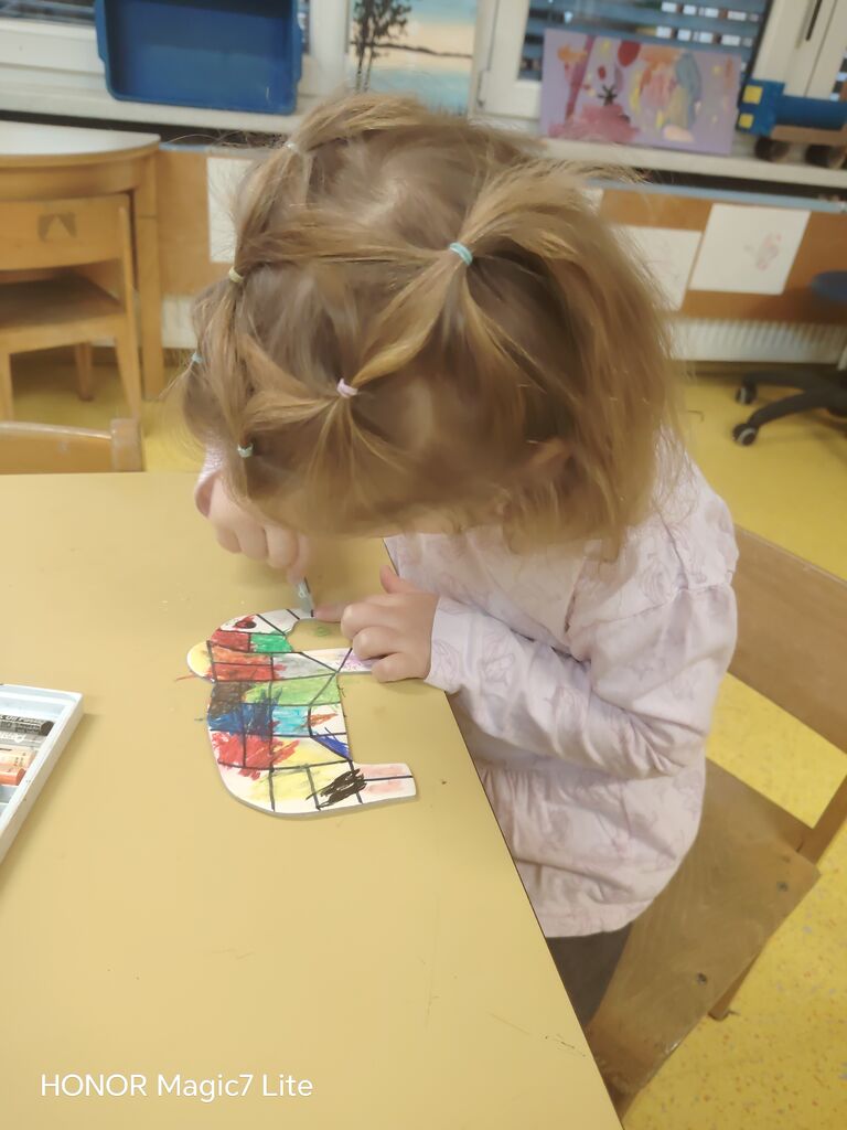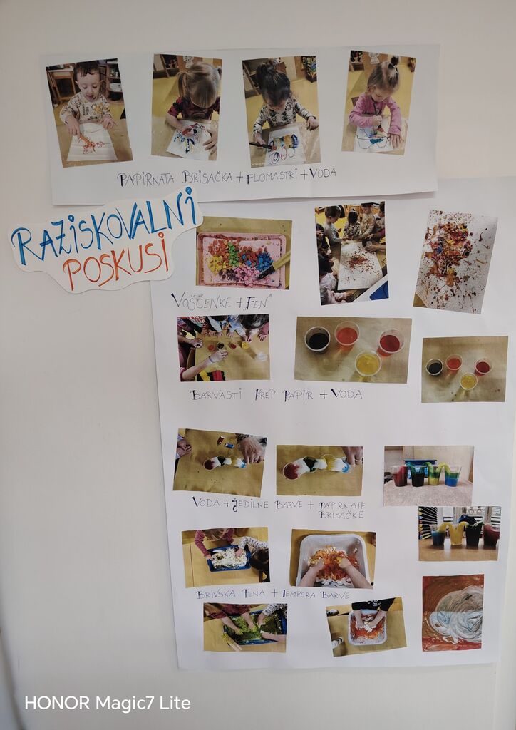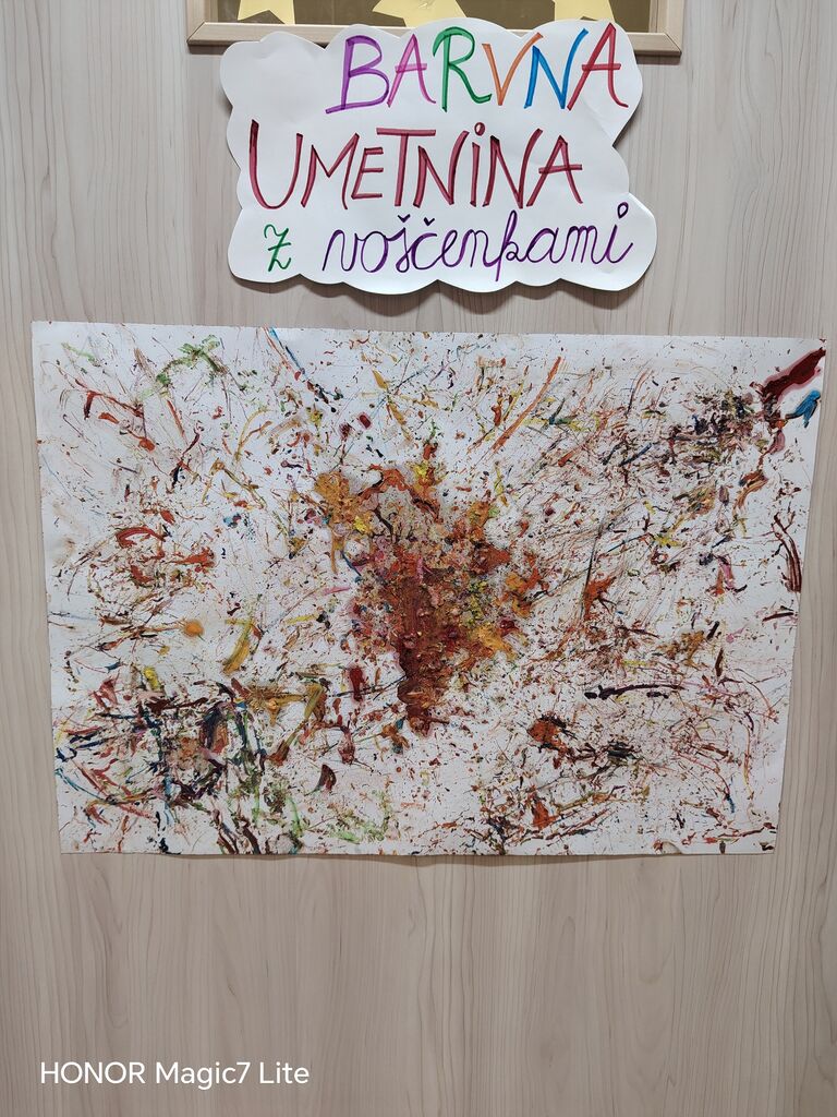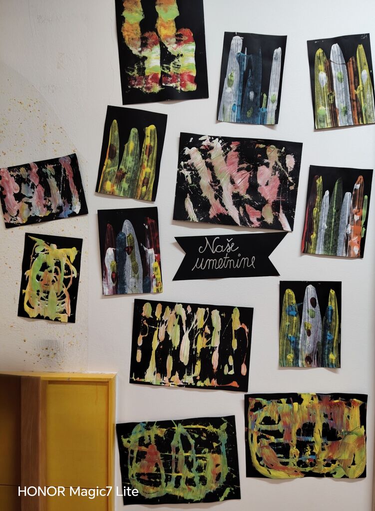 Velik poudarek smo namenili likovnemu ustvarjanju. Otroci so risali, barvali, lepili, trgali, »tapkali«, rezali in ustvarjali z različnimi tehnikami. Pri delu smo uporabljali raznolike materiale, kot so tempera barve, vodene barve, flomastri, barvice, voščenke in barvni papir. Posebno zanimiva je bila barvna umetnina z voščenkami in »fenom«, kjer so otroci z navdušenjem opazovali, kako se voščenke topijo in ustvarjajo pisane vzorce. Ker jih je barvna umetnina navdušila, so otroci s tempera barvami in pomočjo glavnika ali lesene palčke, po lastni izbiri, ustvarili vsak svojo edinstveno umetnino, ki smo jih razstavili v garderobi, da so se jih lahko ogledali tudi starši.
