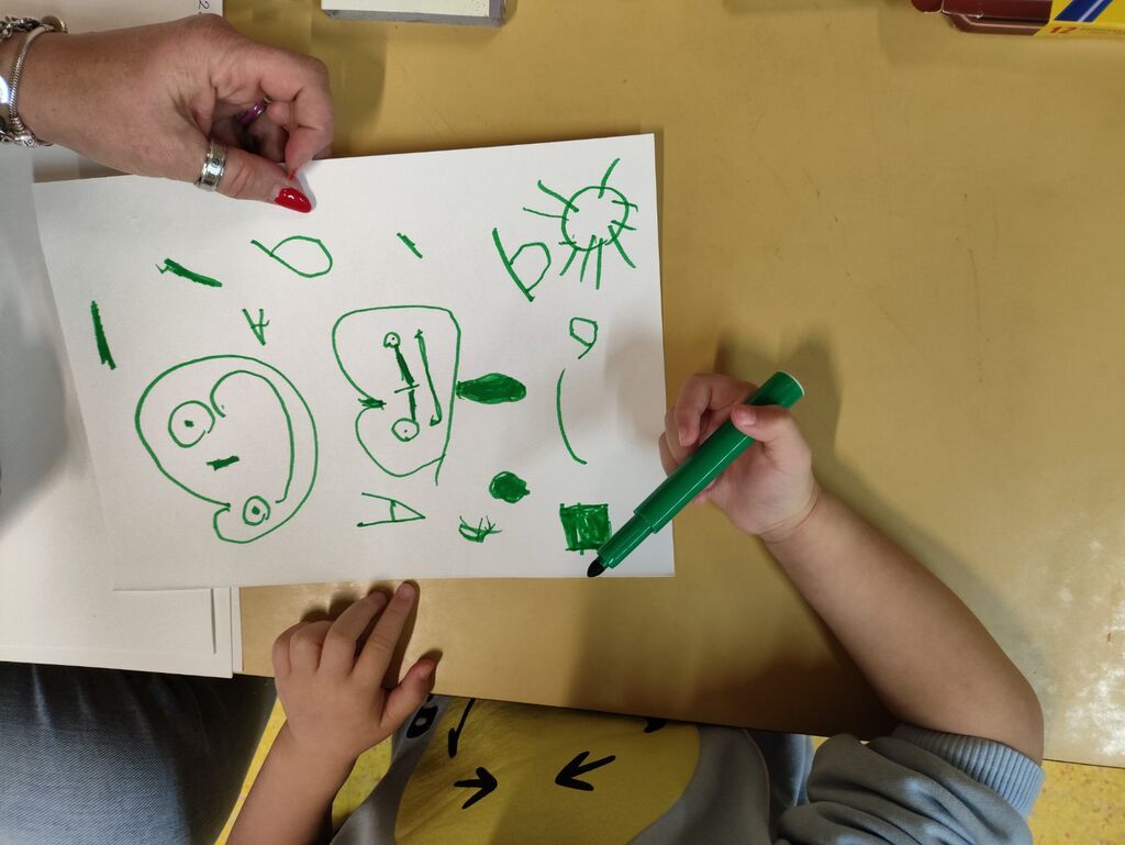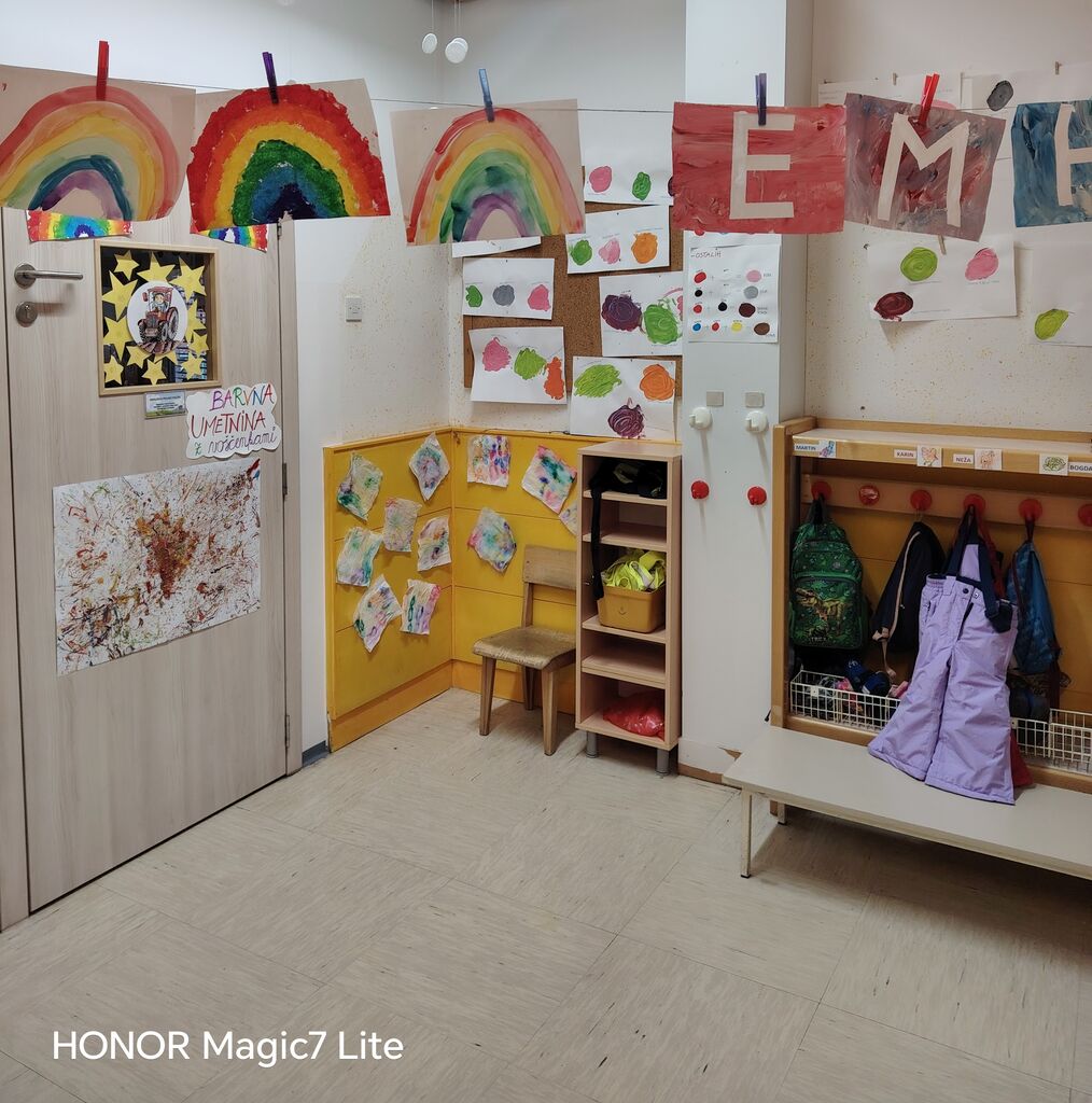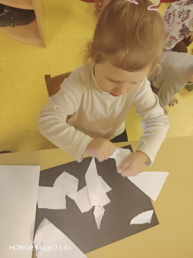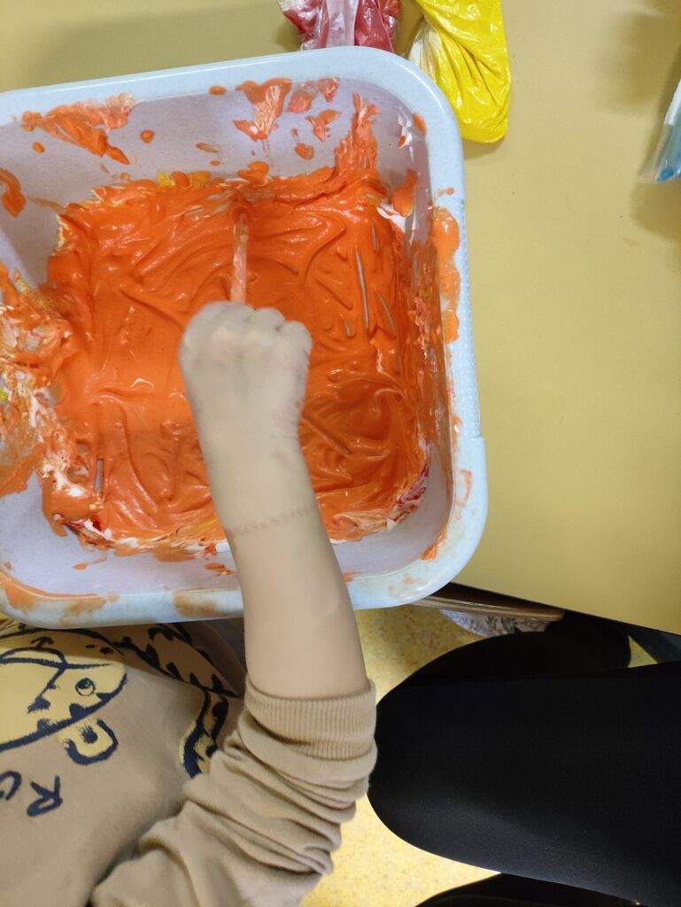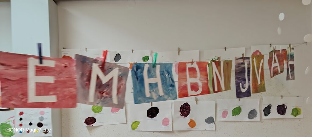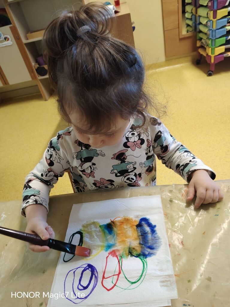 Velik poudarek smo namenili likovnemu ustvarjanju. Otroci so risali, barvali, lepili, trgali, »tapkali«, rezali in ustvarjali z različnimi tehnikami. Pri delu smo uporabljali raznolike materiale, kot so tempera barve, vodene barve, flomastri, barvice, voščenke in barvni papir. Posebno zanimiva je bila barvna umetnina z voščenkami in »fenom«, kjer so otroci z navdušenjem opazovali, kako se voščenke topijo in ustvarjajo pisane vzorce. Ker jih je barvna umetnina navdušila, so otroci s tempera barvami in pomočjo glavnika ali lesene palčke, po lastni izbiri, ustvarili vsak svojo edinstveno umetnino, ki smo jih razstavili v garderobi, da so se jih lahko ogledali tudi starši.