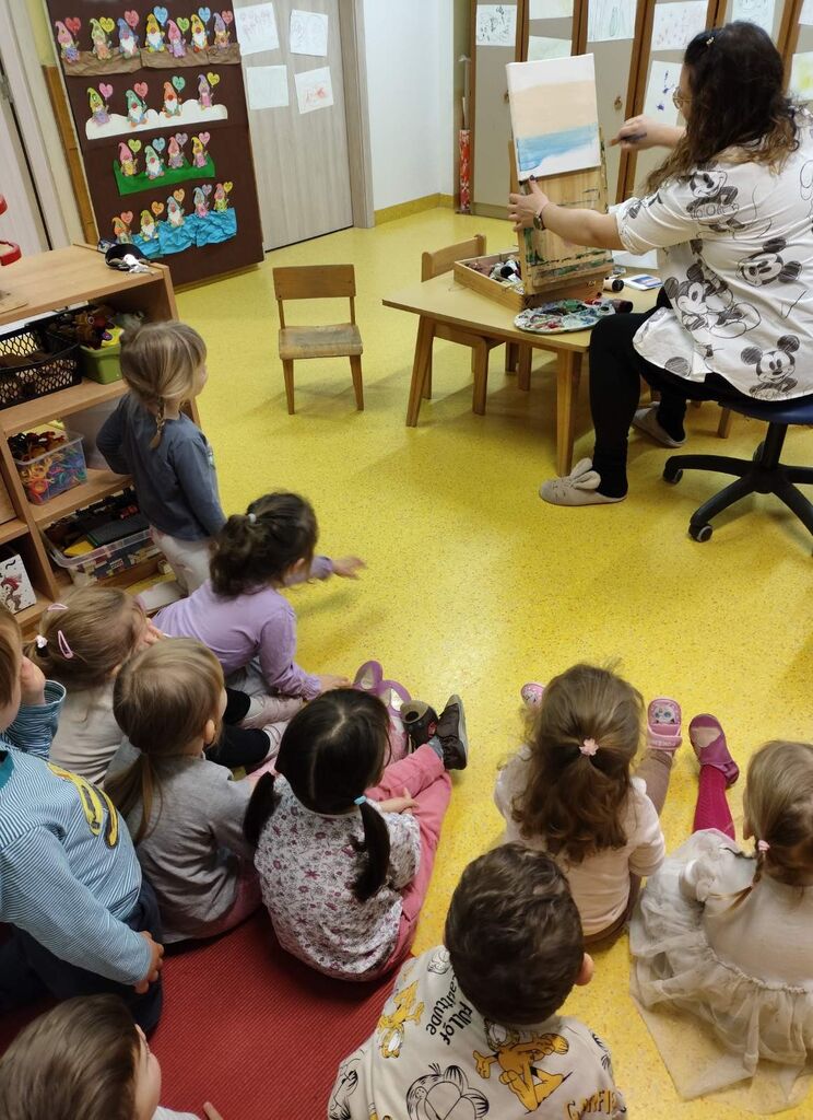 V skupino smo povabili ljubiteljsko slikarko Kristino, ki nam je predstavila svoj hobi – slikanje, ter nam naslikala čudovito sliko sončnega zahoda, nato pa otrokom ponudila priložnost, da se tudi sami preizkusijo v slikanju in ustvarijo svojo umetniško sliko.